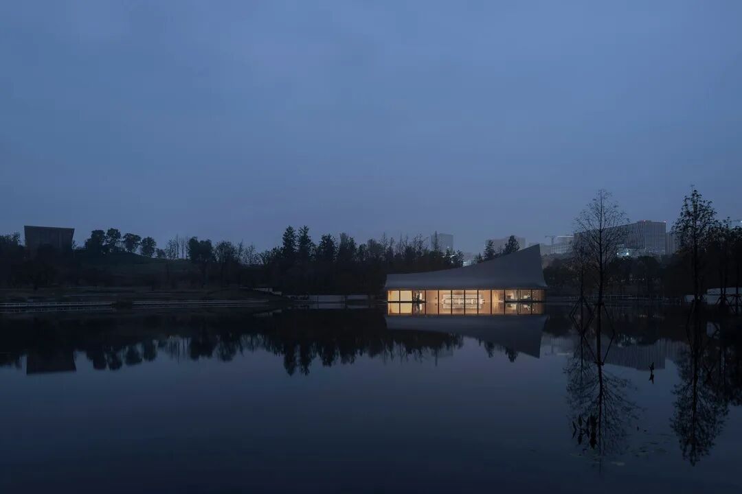 天府美术馆三边环水,位于人工湖东岸的半岛之上。放射性的建筑平面以公共大厅为核心,串联周边展厅空间;如花瓣一般,呈现向环境打开的姿态。