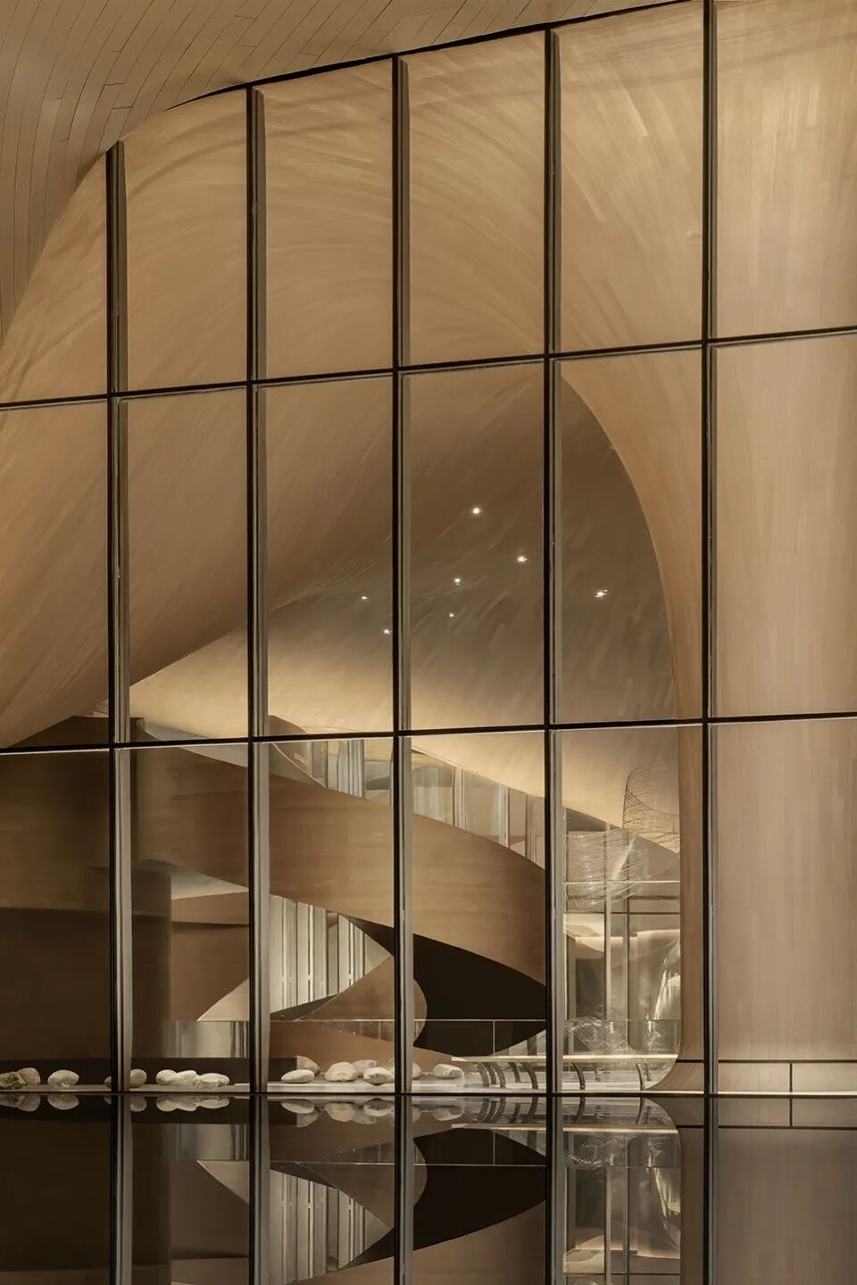 临湖侧的玻璃幕墙延伸至水下近一米深处,灵动的水光和波纹为空间增添更多趣味性。