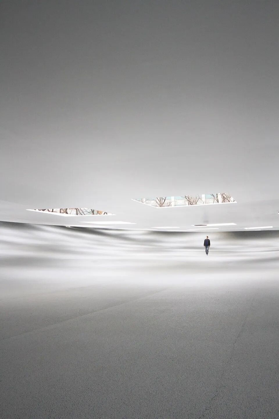 顶面像天空一样弯曲,地面像大地一样凹陷,它们在远处相连,建筑物内部就这样出现了地平线。人从地平线的一端出现,又消失在地平线的另一端。