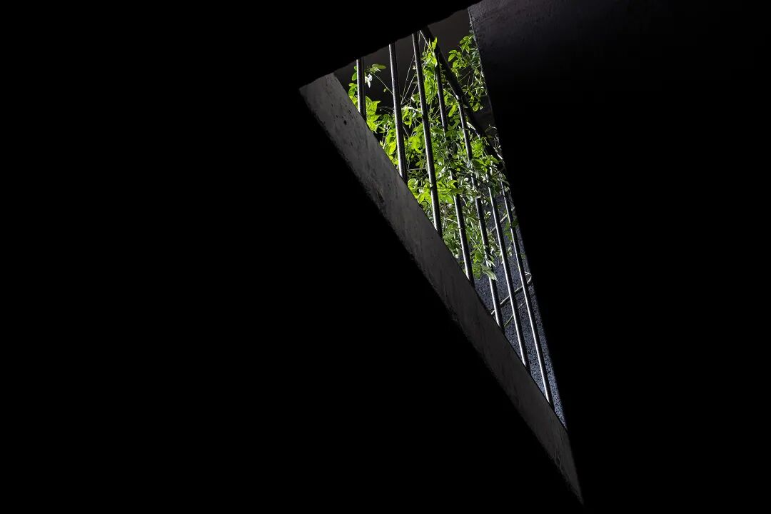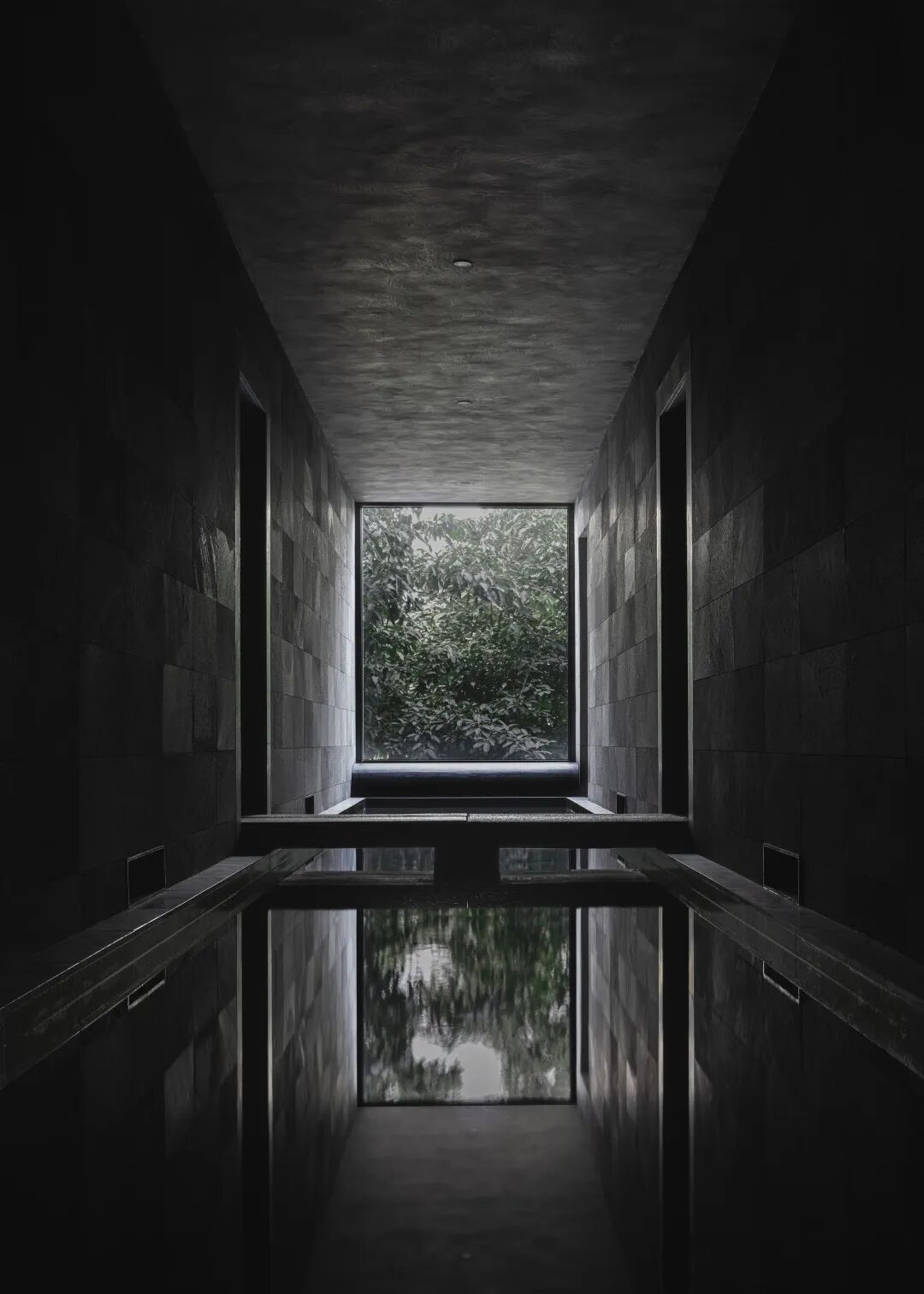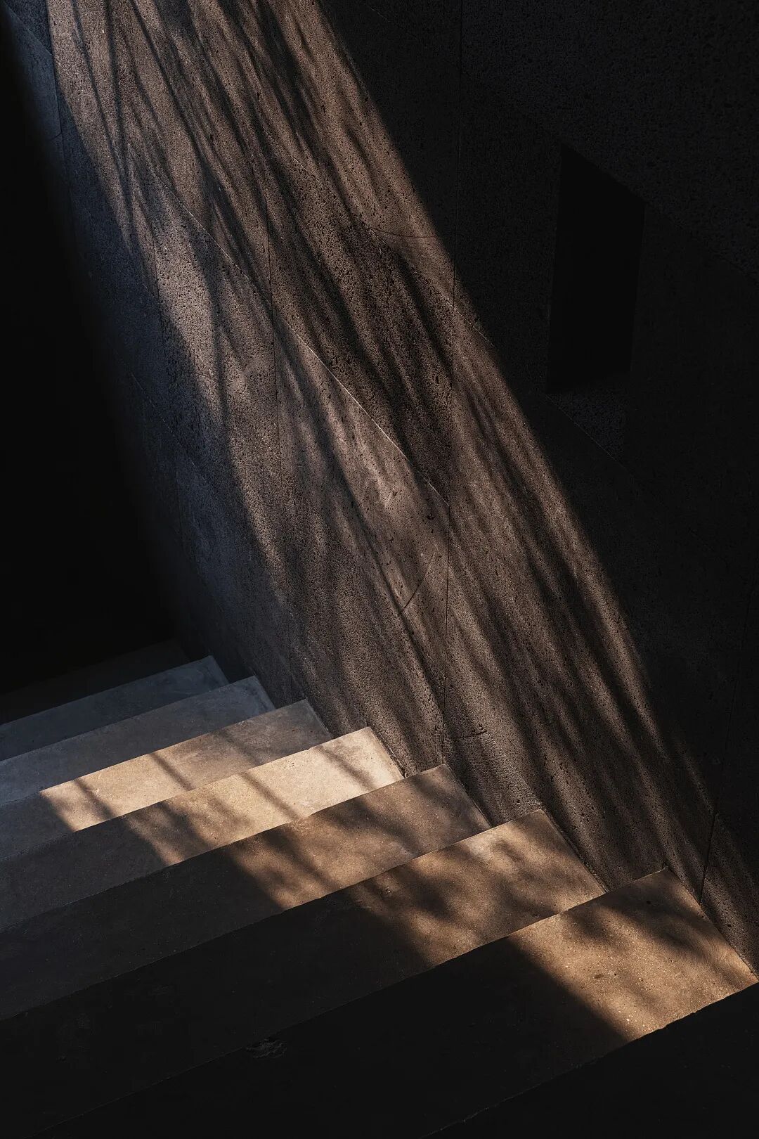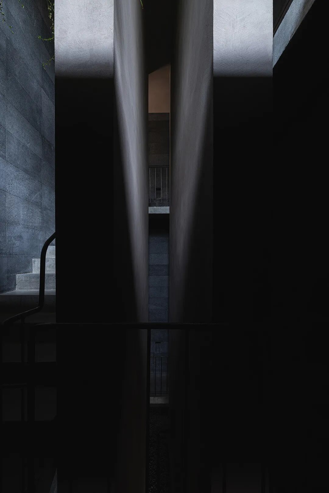 流水从幕墙周围穿流,形成一刚一柔的对仗,沿着碎石铺就的路面环绕其上,能明显感觉到因为这两堵墙的存在,周围被抽象成山间峡谷的氛围感,光影在上行的过程中无限变奏,每一层、每一处都投射出全新的风景,移步易景的未必只有花草,还有满足不同观看角度的结构美,以及建筑本身带来的美妙线条与造型。