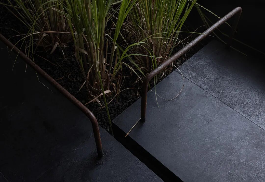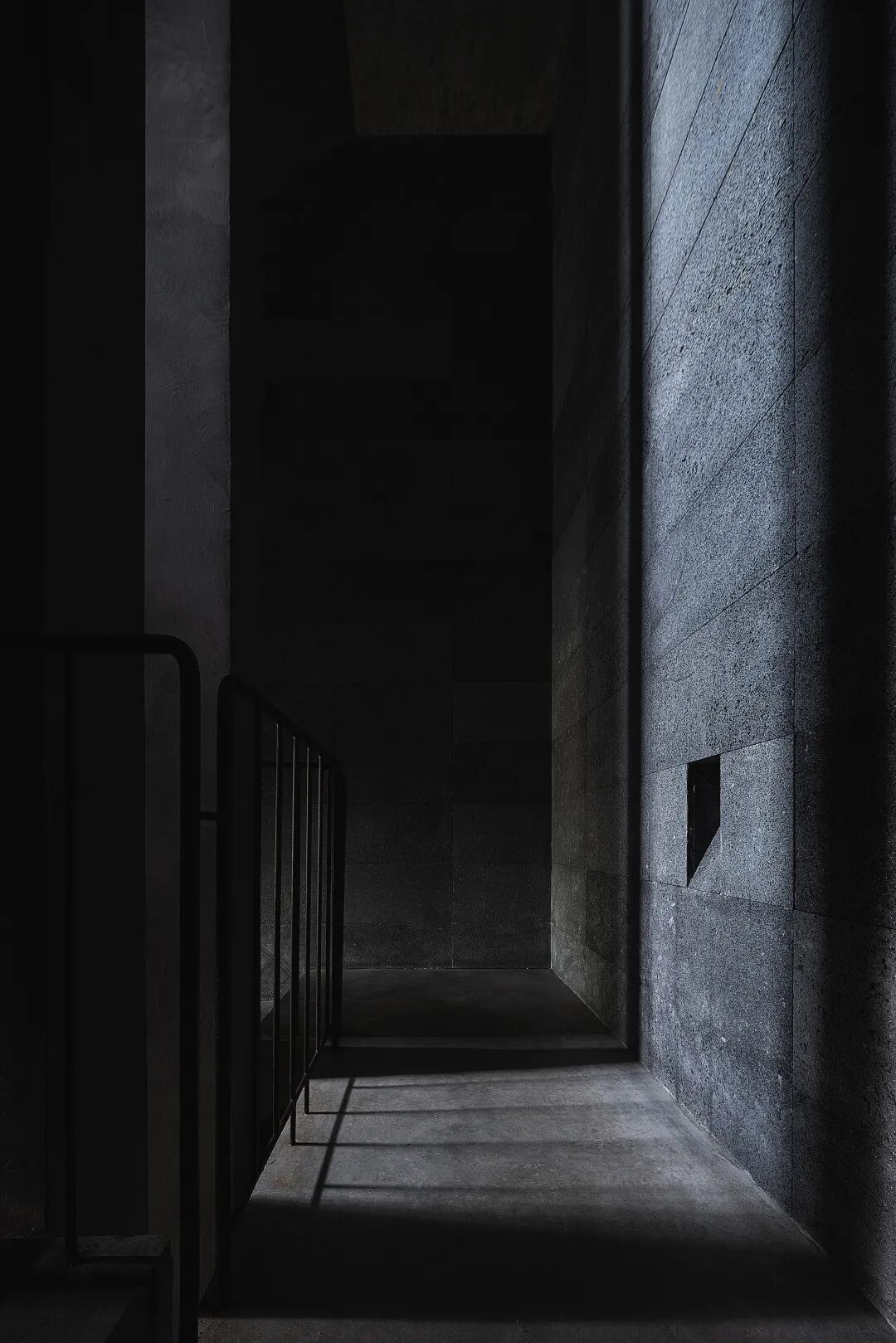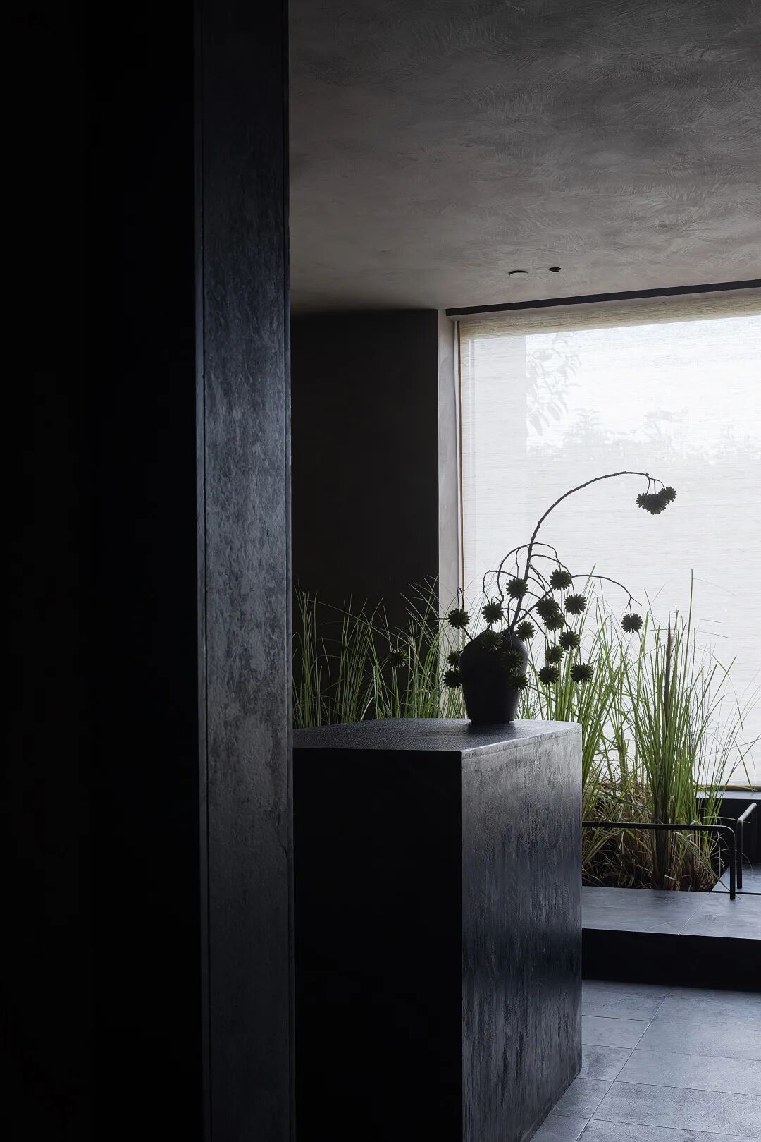 在室内的2层空间中,9米挑高带来更大的挑战和可能,设计引入了游园概念,利用建筑结构重新定义山水。看似「压抑」的黑色空间给人一种宗教般的美感,一楼被完整的「浪费」掉,用火山岩、混凝土与钢板构筑而成的两堵通顶幕墙成为视线主角,构成「山」的意象,它们几乎占据了整个一楼空间,阻隔视线和光线,也暗合古人对含蓄之美的意境追求。