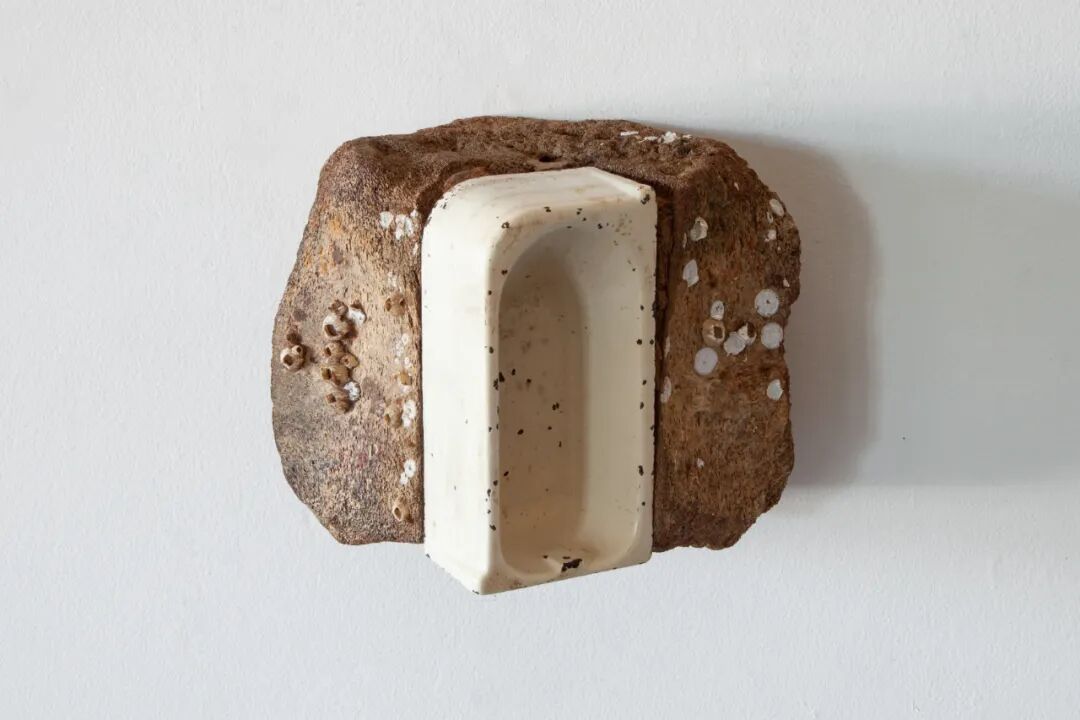 无题, 2022,鲸鱼椎骨化石,微型铸铁浴缸,15.2 x 15.2 x 22.9 厘米