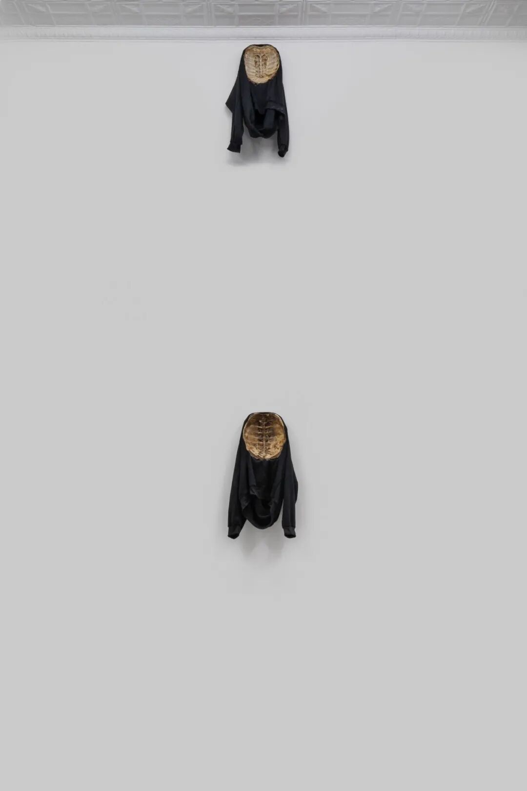 无题,2020 年,龟壳、运动衫,分为三部分,每部分约,86.4 x 19.1 x 45.7 厘米