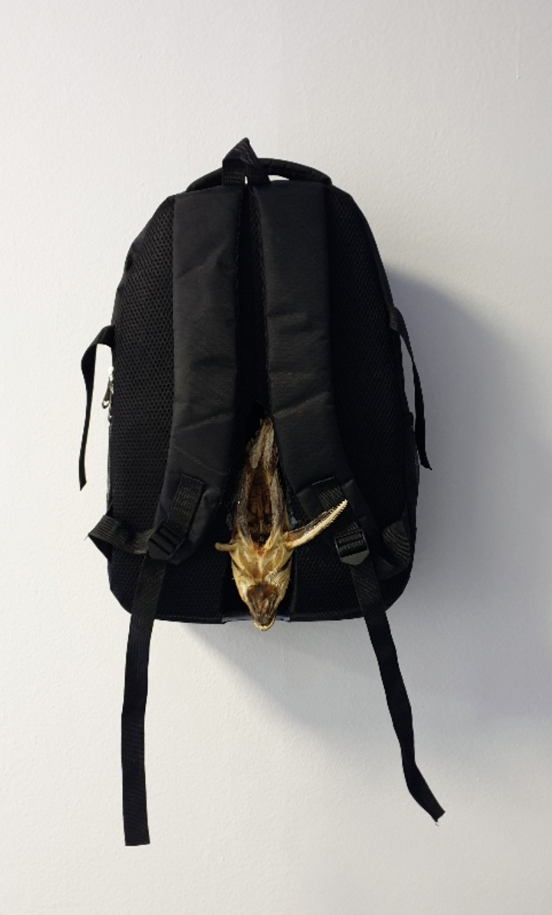 无题, 2019,背包,胶管,鱼,塑料,30.5 × 42 × 14.5 厘米