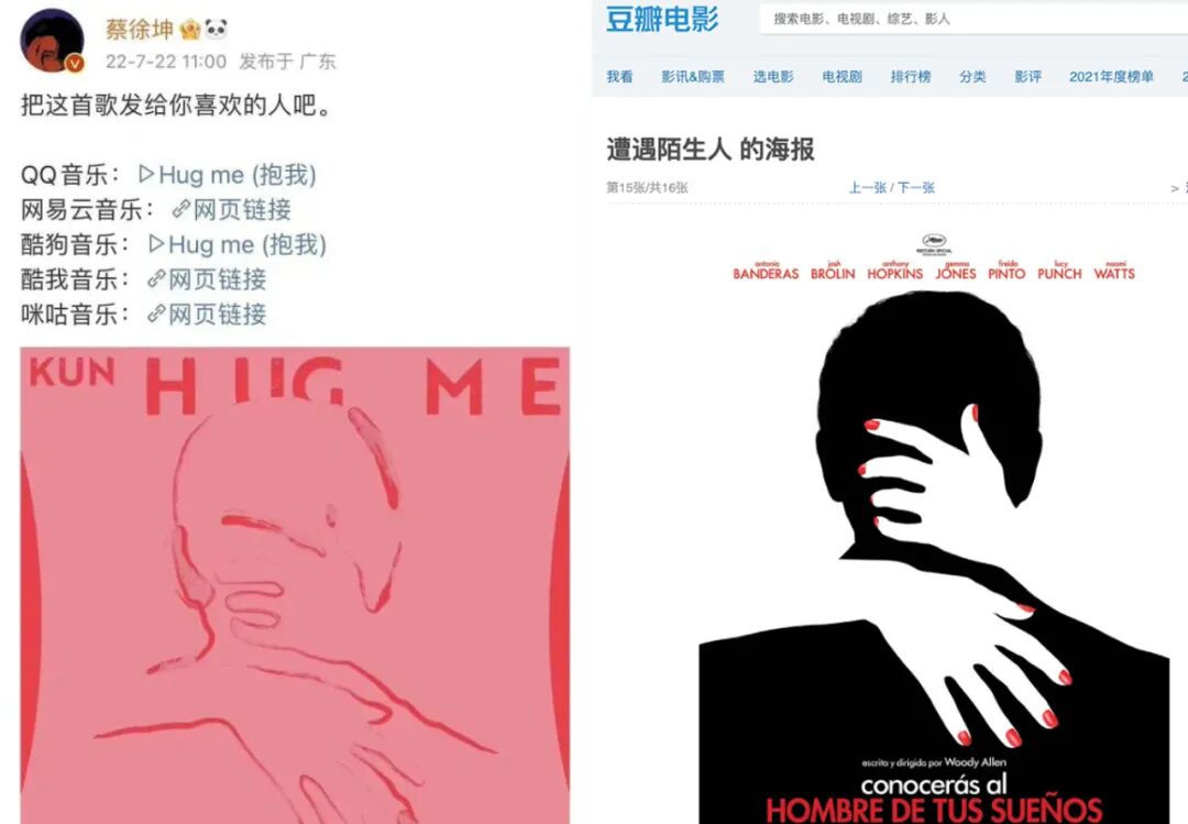 7月22日,蔡徐坤发布了新歌《Hug me》封面海报,当时迅速涨粉20万,新歌也位列榜单第一位,收藏数和评论数都是将近百万级别。没想到随后被网友指出疑似抄袭电影《遭遇陌生人》海报,引发争议。