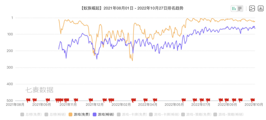 期内君海游戏《蚁族崛起:神树之战》iOS榜单排名大幅回升,其中免费榜自100名左右升至20名左右,畅销榜自TOP 200升至TOP 100 。