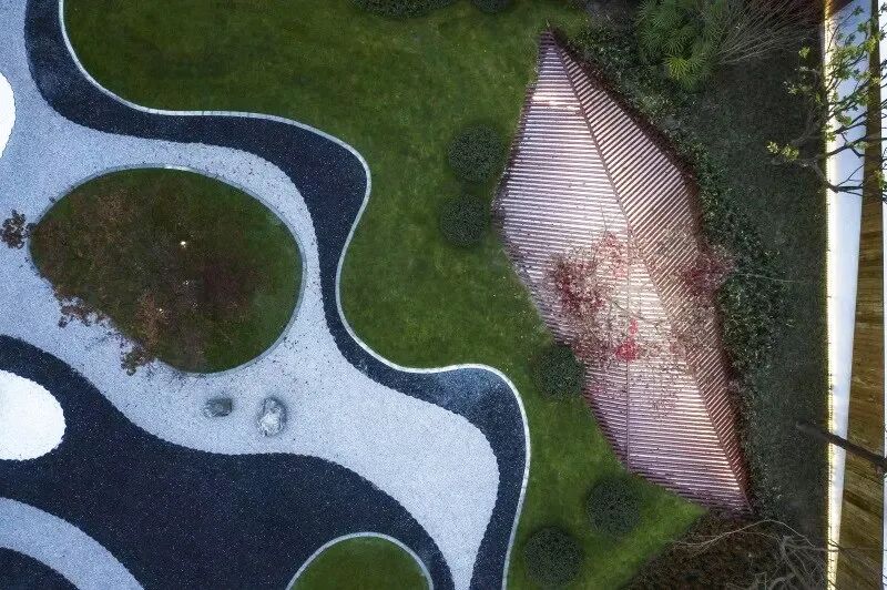 除此之外,连廊两侧设置了两个采光井,镂空的采光井中,壹颗大树拔地而起,穿过采光井露出摇曳的身姿,打破了采光井空洞的设置,是连廊上下两个空间独特的交流方式。