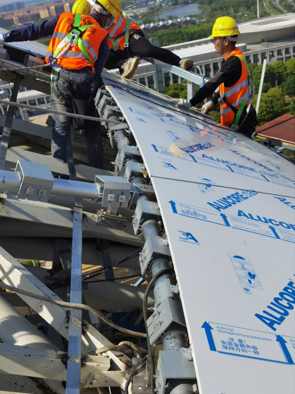 测量放线→基层清理→弹龙骨安装线→(基层及龙骨)打(钻)孔→安装膨胀螺栓→固定基层龙骨→钻螺钉孔→安装止滑扣→安装蜂窝板→打胶→加盖封条→验收