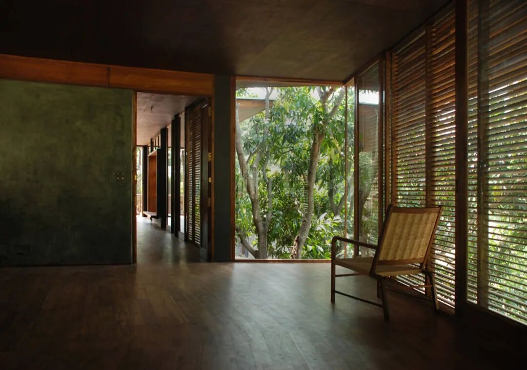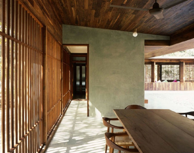 Palmyra House由南北两栋建筑组成。这两栋建筑的外立面皆是木质百叶窗,既满足了充足的采光需求也可以确保房间的私密性。建筑物整体结构选用当地特有的硬质木材,并采用了传统的榫卯结构进行搭建;宽大的百叶窗则是用当地一种棕树做材料,再经过手工雕刻制成。