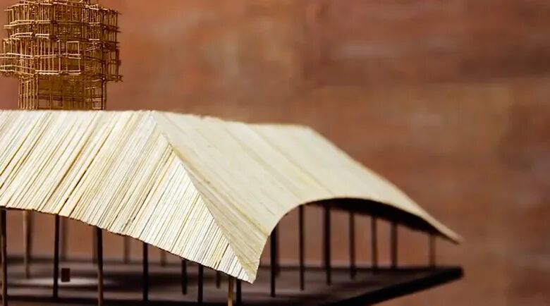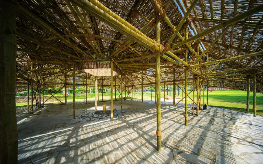 比乔伊·杰恩使用了长达7公里的竹子、50 吨石材、26干米长的绳子为墨尔本创造一个与众不同的夏季凉亭展馆,生动地体现了杰恩对于传统手工艺和人类生活连接的设计理念。展馆使用了特别从印度进口的竹竿和5000根木钉,就连屋顶使用的木板也是由印度工匠用时四个月编织而成的。建筑上方的雨棚和屋顶材料采用了传统的印度工艺建造,混合了牛粪和土壤来连接竹结构,并且覆盖了防水的石灰涂料,这些都能与澳大利亚的景观色彩融合在一起。