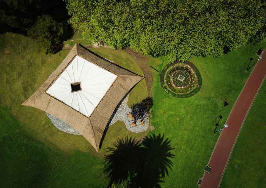 展馆的屋顶中心是开放的,站在展馆中央可以感受到天空与大地的联通,一个手工编织塔楼坐落在展馆的入口旁,造型像是欢迎的手势,迎接着人们的到来。比乔伊.杰恩介绍展馆设计时曾说;"我希望它成为社区结构基本性质的象征。我将MPavilion视为一个参与的场所,一个发现世界和自己本质的空间。"
