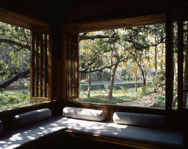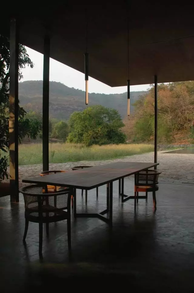 Belavali住宅位于阿利巴格(Alibag),坐拥当地5英亩(约20234平方米)的水稻田。设计师的设计理念是希望营造出一种花园凉亭的感觉,所以房子东临森林西临大片梯田,一副田园气息。