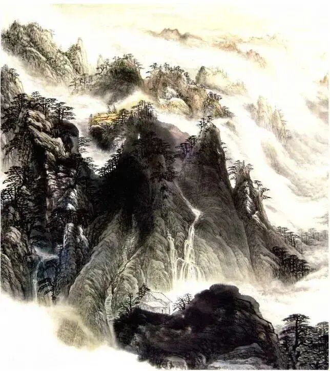 步骤三:画云海。画云海要注意云的动感,此幅主要表现的是瀑布云,需要将云的动态画得像瀑布一样有流动的感觉。可以先用淡墨勾、皴出云的形态,再层层积染,可利用水的痕迹让云更有层次感,这是干画法。亦可用湿画法,即用喷壶将纸打湿,待七分干后再画。以上两种方法也可穿插运用。