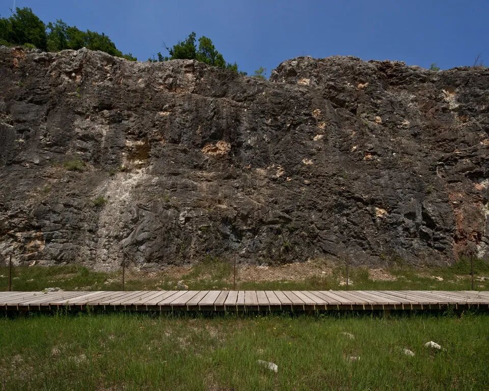 木制走道则采用当地的刺槐木建造,沿着采石场的表面布置,从而延伸了横穿沼泽的人行道。这条路线以钢筋混凝土墙(即废弃的破碎车间的基础)为特征,增加一系列由钢筋支撑的栏杆,从而提高自身的安全性能。