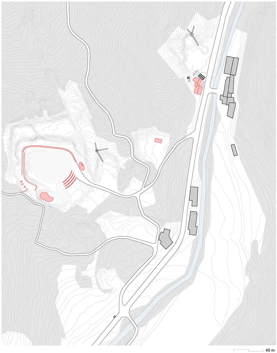 采石坑规模不大,形状如同自然弯曲的手,曾经采石的痕迹经历了岁月的侵蚀,呈现出一种“人工-自然”的图景,特别是暴露在外的石壁,峥嵘奇峻,给建筑师留下了深刻的印象。