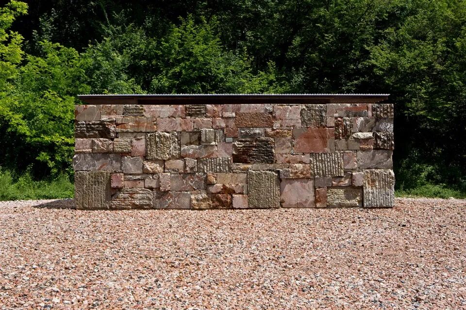 建筑材料选用毛石磊筑,而其中的大部分石块来自于平整场地时候挖掘出的石头。建筑师希望从形式和物理属性上表达建筑是从场地中生长而出的概念。