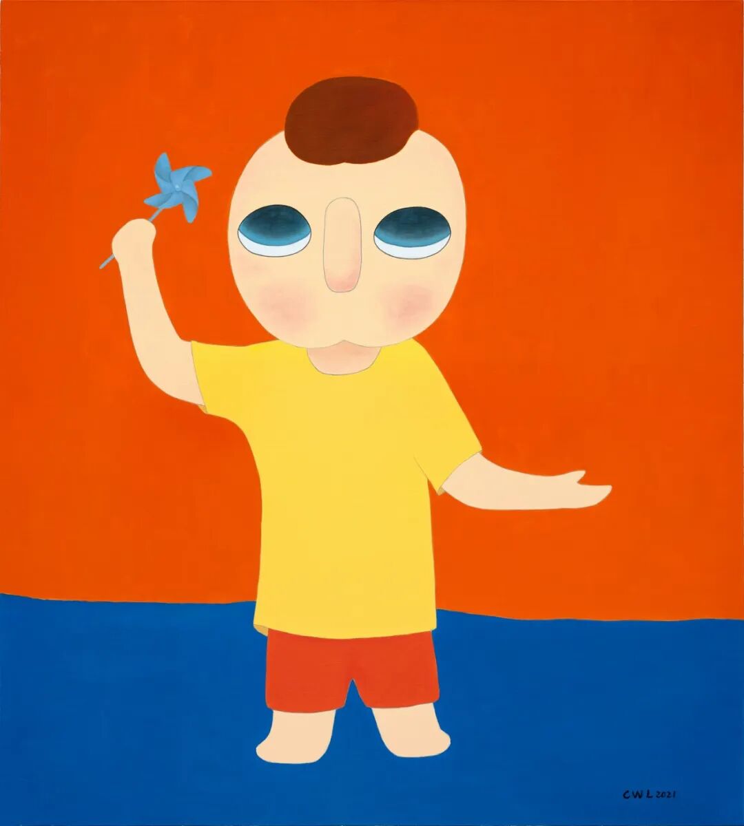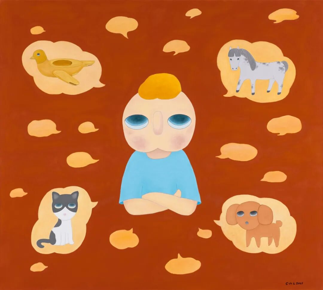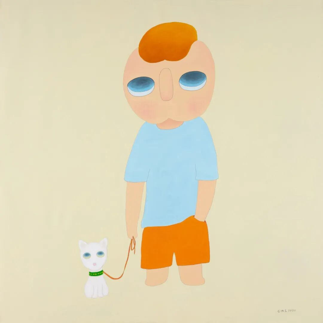 蔡万霖是一位用直觉创作的艺术家,他将自己的经历、阅读、以及对生活周遭事物的观察、体验相叠加,在时间的重叠中建立生命本体的联系。蔡万霖所创作的艺术形象“yy”,一个无嘴无耳、眼神空灵的小男孩,被认为是艺术家具有高辨识度的风格代码。该艺术形象既映射出艺术家的自我观照,也象征着在时代徘徊中思考着生活本质与方向的独立个体——没有嘴巴,却用一种沉默的状态去表达语言之外的意味;眼神空寂,却又蕴藏着一种天真的平静无畏,唤起观者心底的共鸣与慰藉。艺术家在主人公yy身旁配以小猫、小狗、小马等灵动可爱的动物形象,在唤醒童趣之时,承载着令人玩味的寓言性。与“yy”幽蓝空寂的眼神对视,不同人生阅历的观者都会产生不一样的想法——有人看到了童年的纯真,有人看到了成年后的沧桑,更有人看到了艺术家多年的禅修状态。如果说“yy”起初诞生于艺术家本人的部分自画像,那么“yy”在后期面向公众时则成为了一面照见内心的镜子,使每一个观众通过凝视“yy”而直视自己。