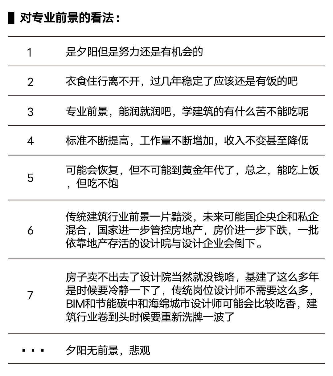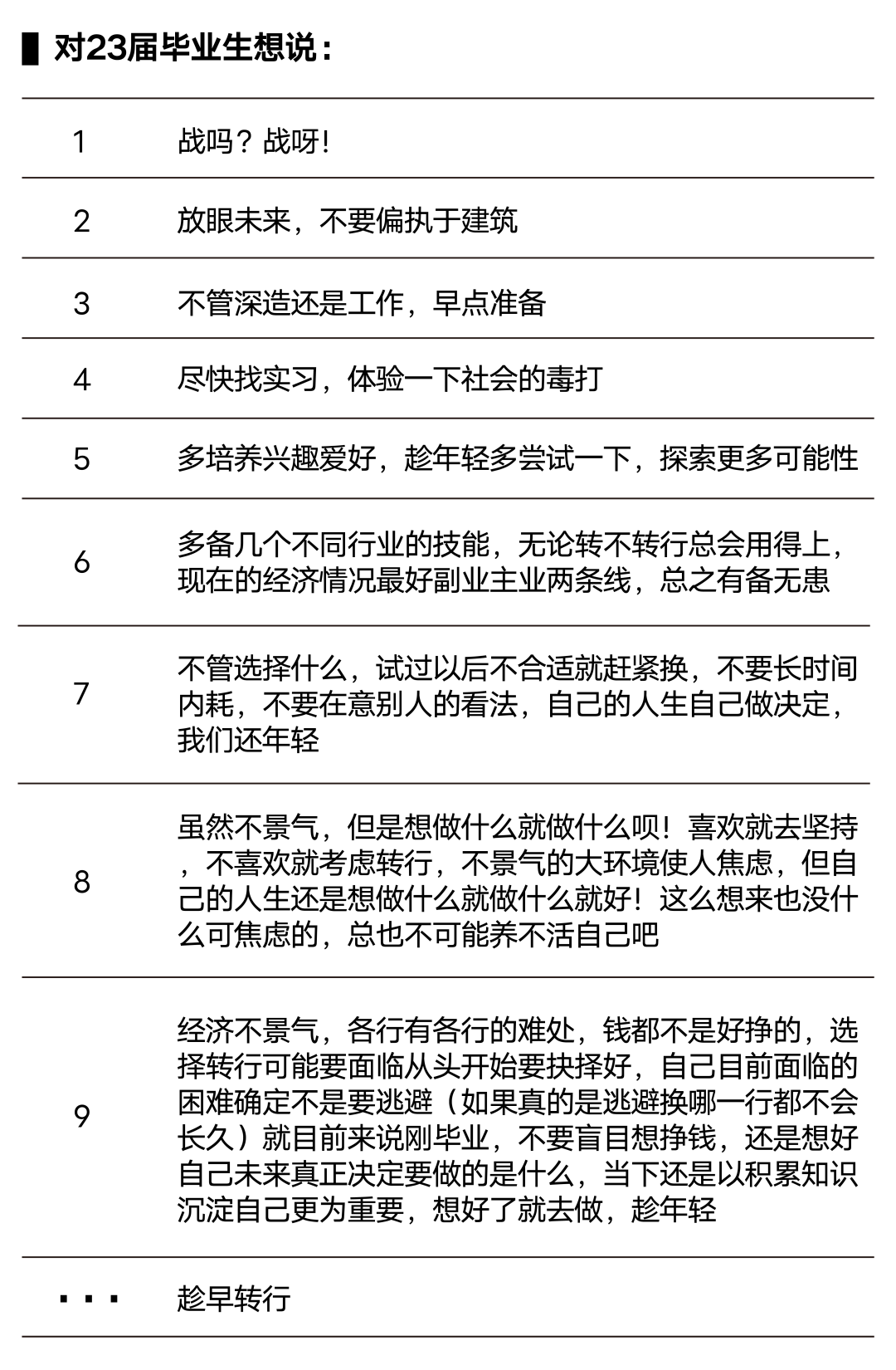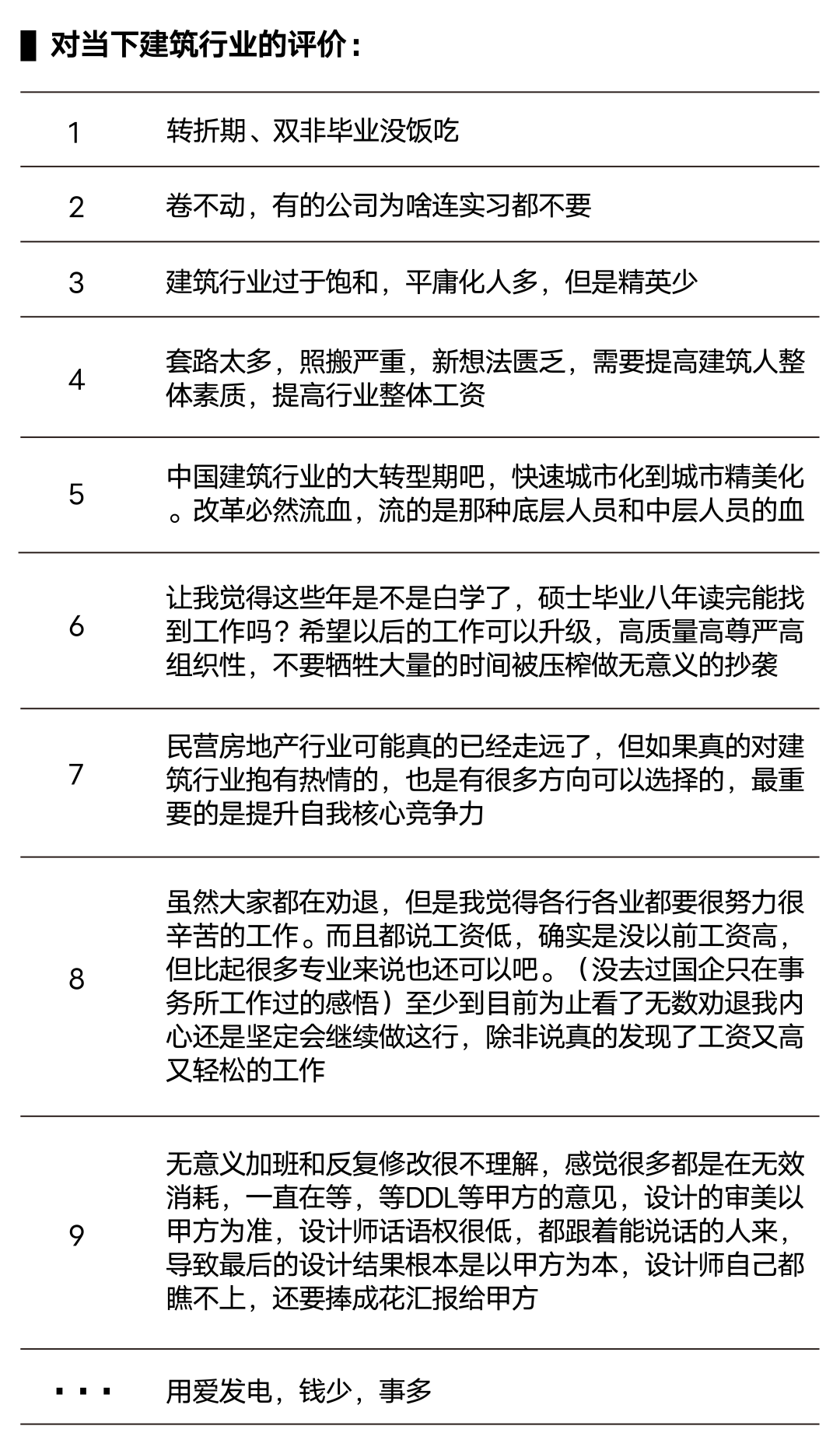 8.5:1.5这压倒性的数据比,大环境下,大家都想跑呀 !不过也还有14%的同学选择坚持做建筑,大概是非常热爱建筑的人了!Respect!
