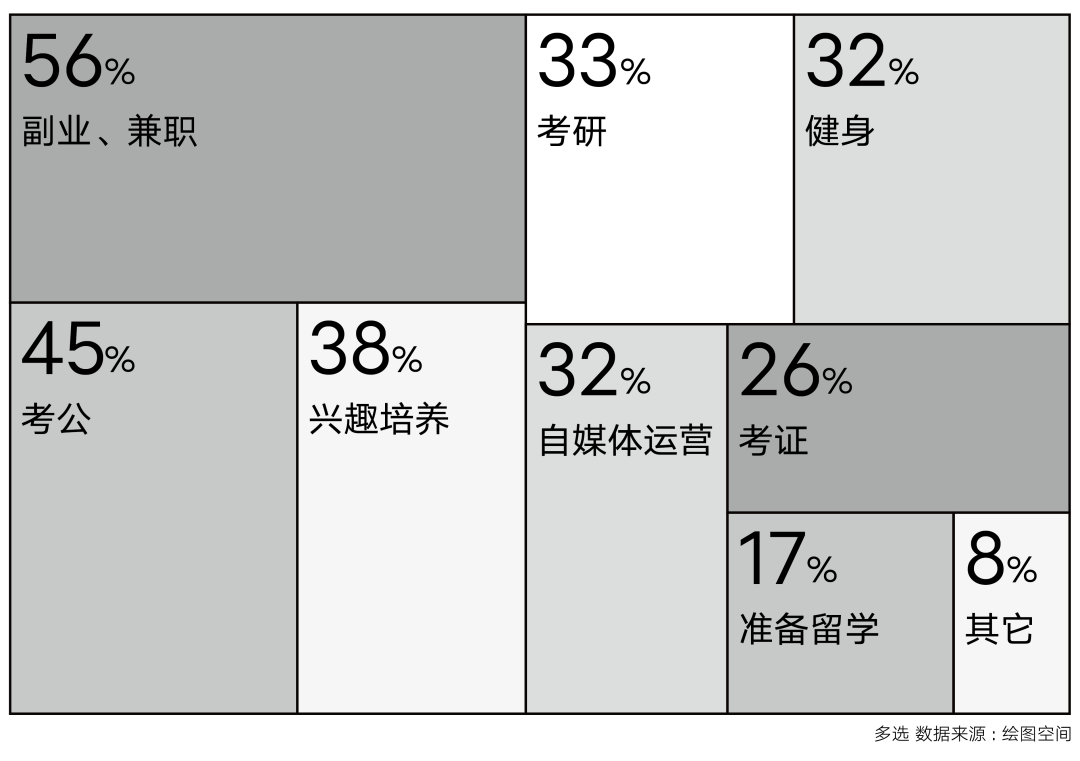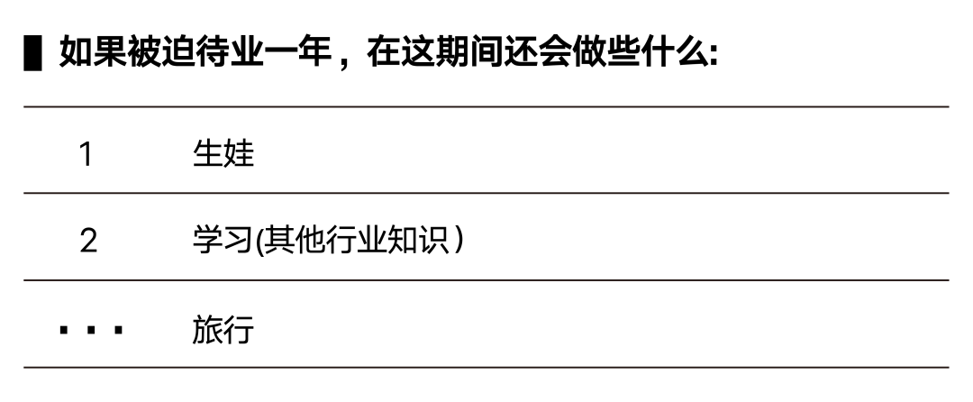 待业期间可以做的事情,除去已有选项,还有同学选择了“生娃”(可能是硕士毕业生小姐姐答的哦),如果有合适的对象,家庭条件较好,的确也是可行的啦!大部分同学还是想要去旅行,这也是小编身边被裁员的朋友们较多的选择,工作的时候疯狂加班,没有娱乐时间,待业期间,可以趁着旅行感受世界的多姿多彩!