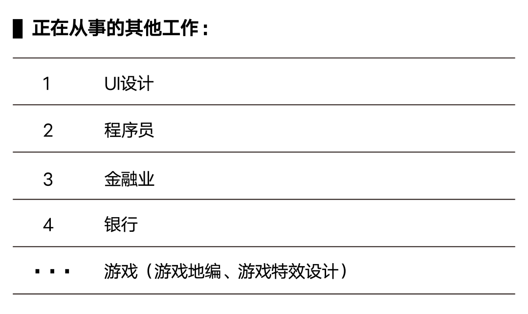 从事其他工作这13%的人群里,较多同学选择了游戏方向,这行业专业性强,要求高,前景好,如果有想法,能力够,的确是较好的转行选择。同时还有一部分同学选择UI设计、程序员、金融业、银行等。