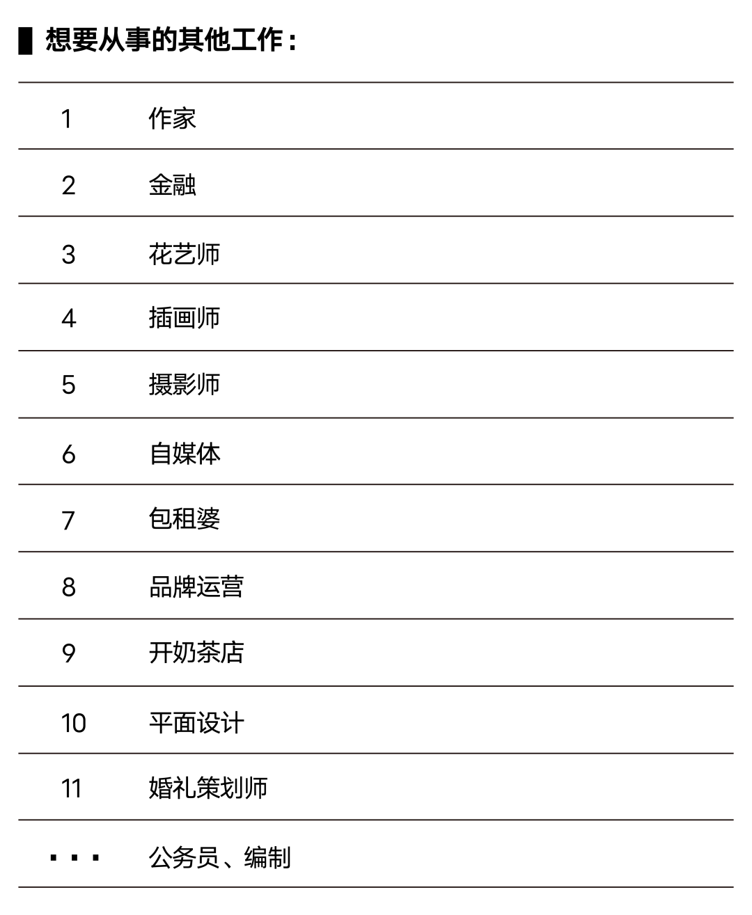 想要从事其他工作的方向也不少,作家,摄影师,插画师等等。哈哈哈哈哈,还有想当包租婆的,哦~姐妹,这也是我的梦想。