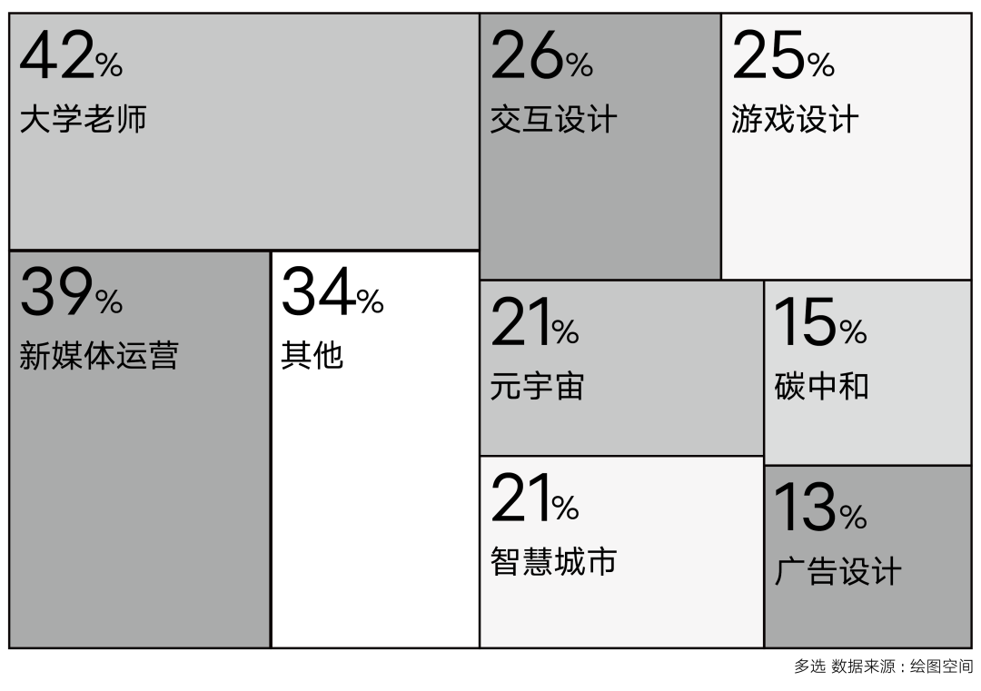 选择交互设计、游戏设计、元宇宙、智慧城市的占比都在20%-30%之间,较少的人选择了碳中和与广告设计。