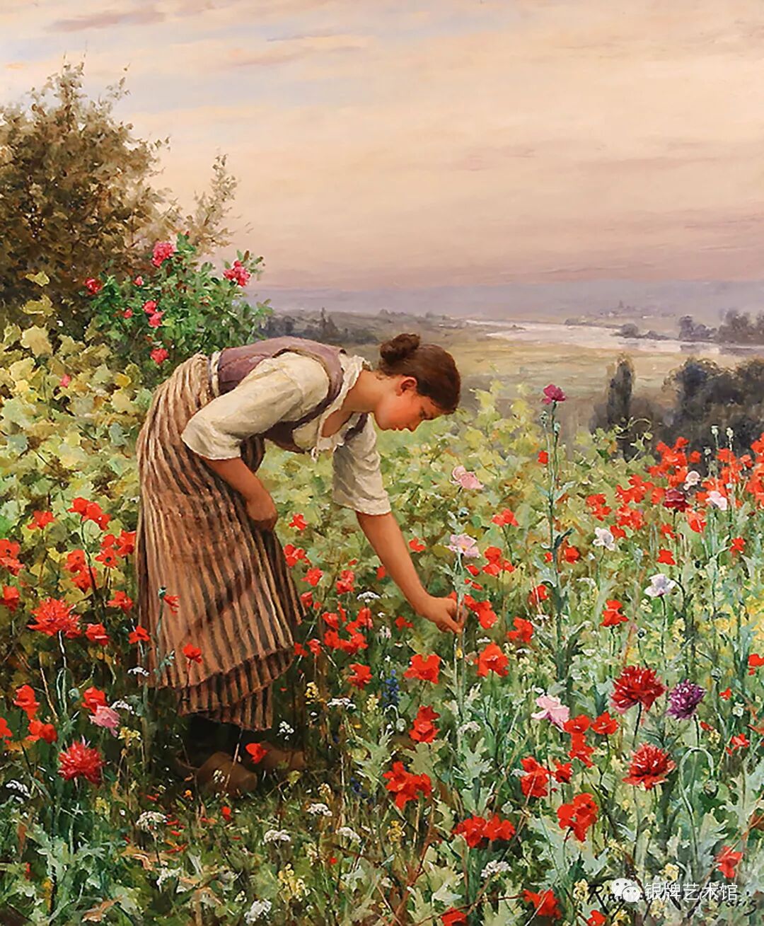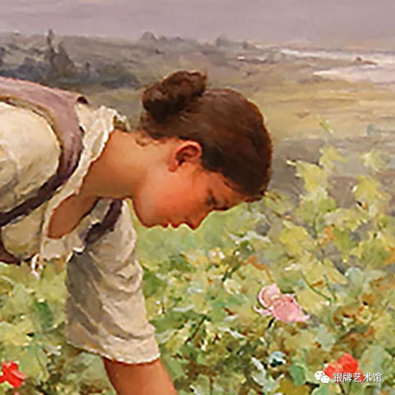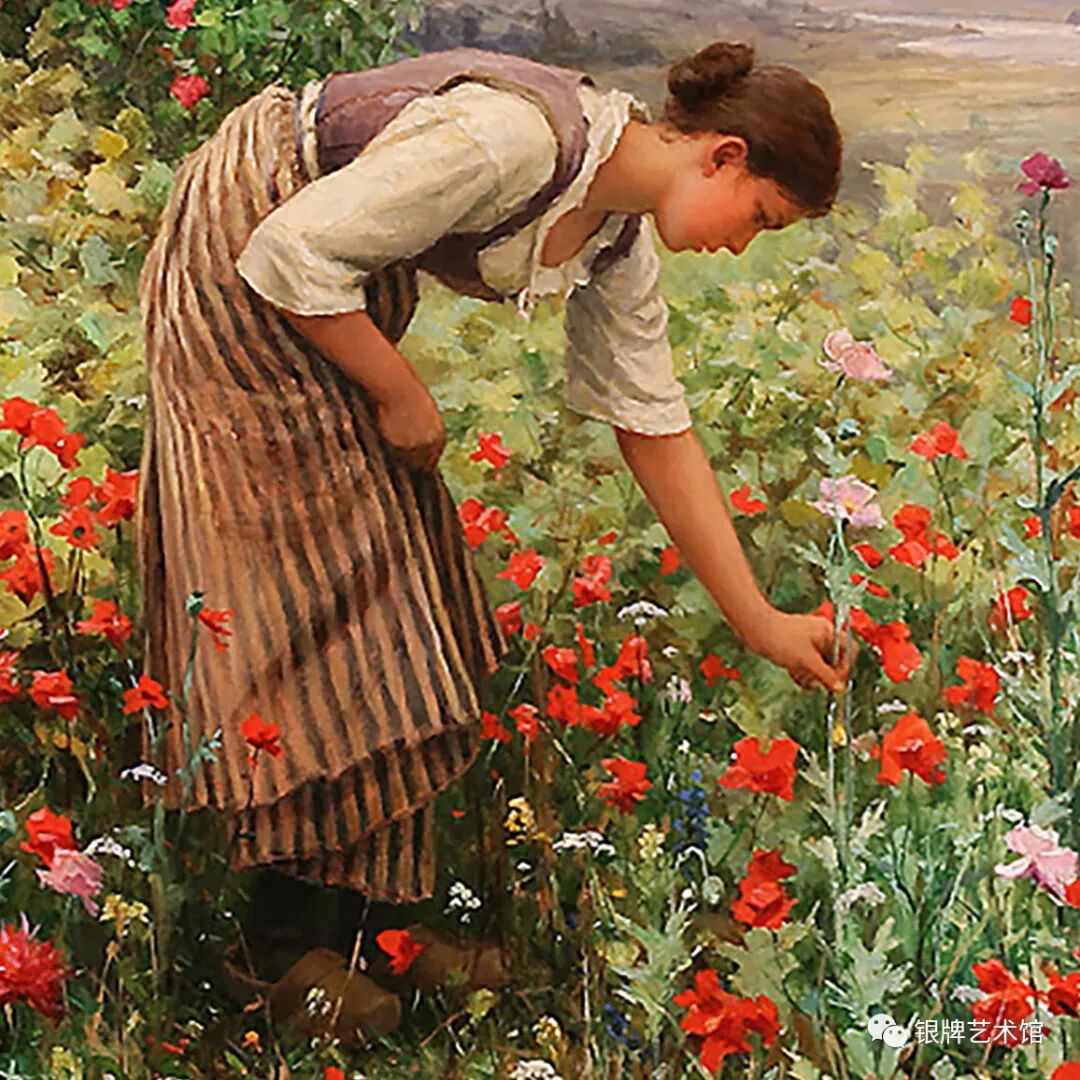 采摘罂粟花的女孩 大家好!今天给大家介绍美国画家奈特创作于1880年的油画作品《采摘罂粟花的女孩》。 局部图 丹尼尔·里奇威·奈特,美国画家。出生于美国宾夕法尼亚州费城,曾在巴黎高等美术学院学习,后来在梅瑟尼尔的私人工作室工作。 局部图 1872年以后,他定居在法国,在塞纳河边的泊西有一所房子和工作室。 局部图 1889年,他的画作在巴黎世界博览会参展,获银牌荣誉和十字勋章。 局部图 1893年获宾夕法尼亚美术学院金牌荣誉和迈克尔皇家骑士勋章。 局部图 他主要描绘身在户外的农家妇女形象,以这一题材取得了巨大的成功,他的画作大量是以鲜花美女为主题。 局部图 《采摘罂粟花的女孩》这幅画通过描绘农家少女弯腰采摘罂粟花的情景,展现了女孩优雅的姿态,同时鲜红的花朵和金色的天空映衬着女孩微红的脸蛋,人与自然交融在一起,令人赏心悦目。