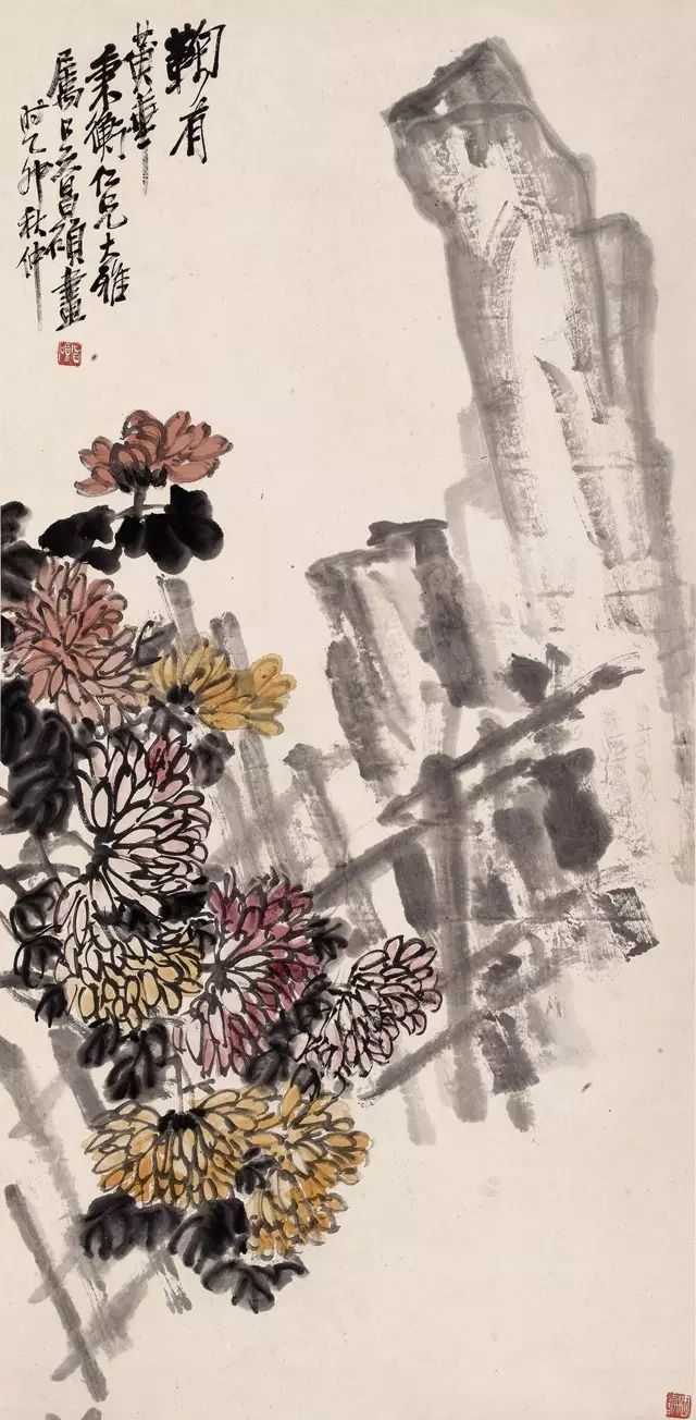 此幅《菊石图》是吴昌硕晚年的大写意精品之作。菊花枝干用笔融草篆于一炉,浑劲老辣,杂而不乱,线条“篆籀之气”最能体现其书画相通之长。老干挺拔,新枝矫健,花团锦簇,芬芳之气扑人眉宇。