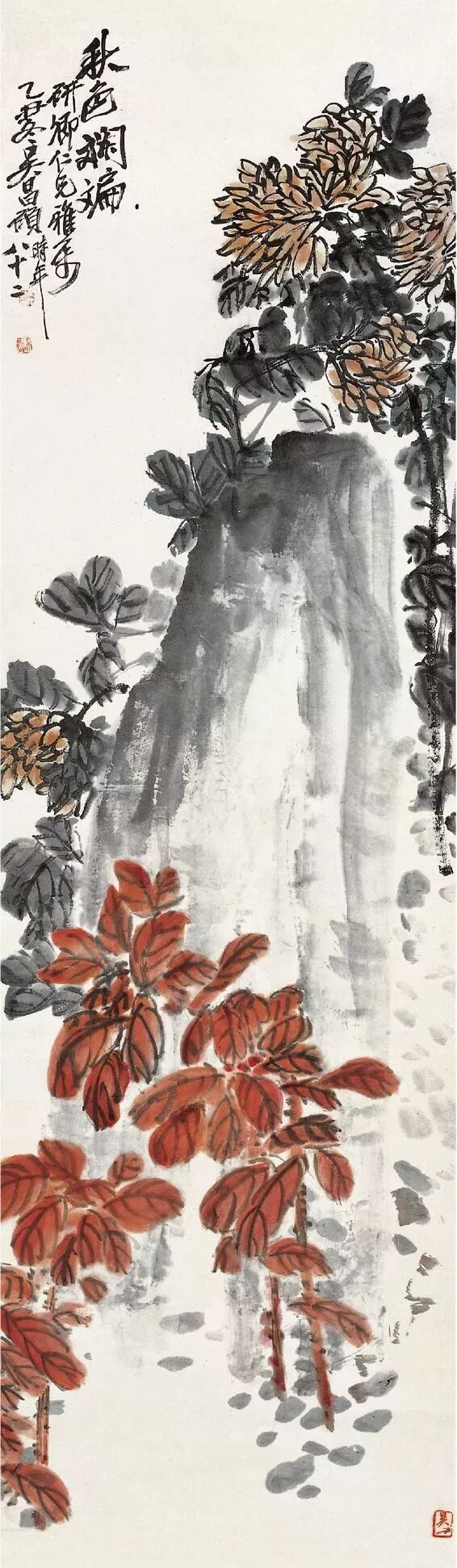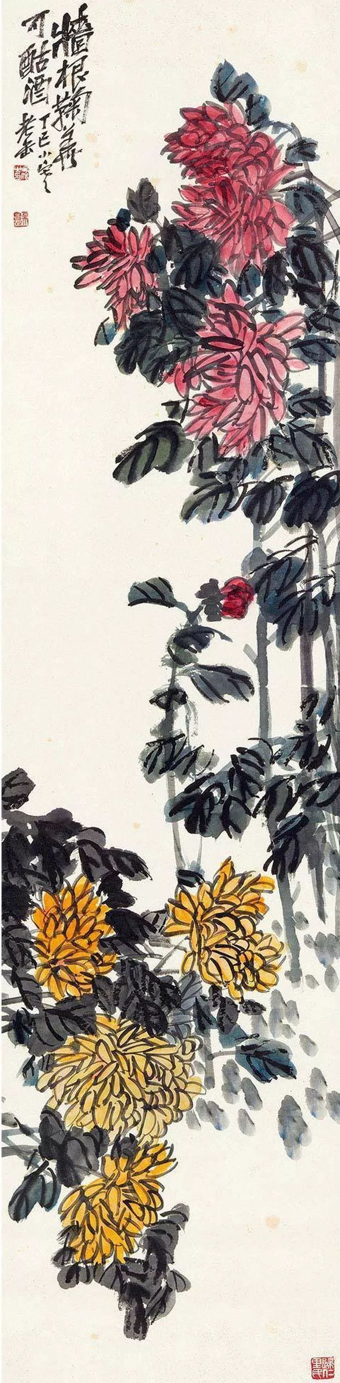 这是吴昌硕 54岁时在苏州所画的《延年益寿》,画面上勾勒出两丛菊花,花朵团簇绽放,一深红,一黄艳,俯仰向背,大小错落,相互映衬,煞是好看。用彩墨泼写菊叶,浓淡相间,层次分明,显得菊花枝繁叶茂,生气盎然。