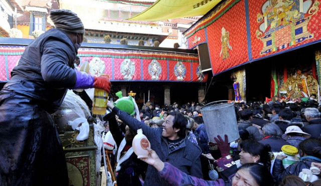 大昭寺内,信众面对白拉姆像,虔诚投献哈达;不少人将自带的青稞酒倒入院中心的大酒壶,随即从酒壶底部取饮,以求女神加持,带来好运。