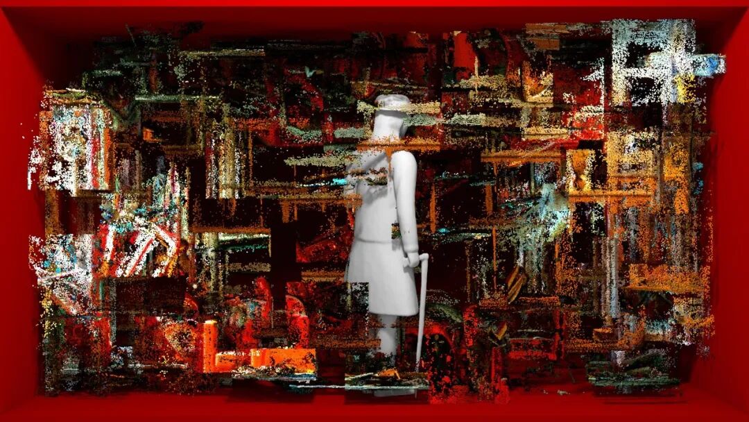 这个影片中的素材像来自一段2022年初在上海拍摄的街景,艺术家用自己的3d扫描形象,在空无一人的街景上,进行了一场虚构的走秀。