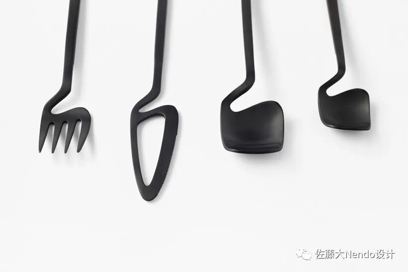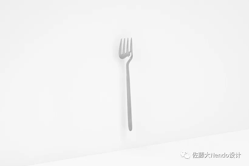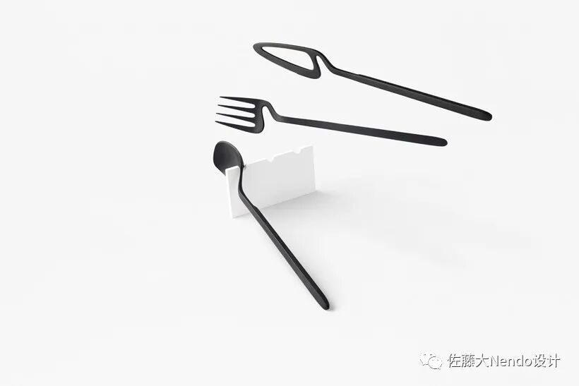 The cutlery has been reduced to the absolute minimum,limiting the amount of material used whilst still retaining its functionality,left remaining is the outline of the cutlery like the image of a skeleton reflected in an X-ray.
