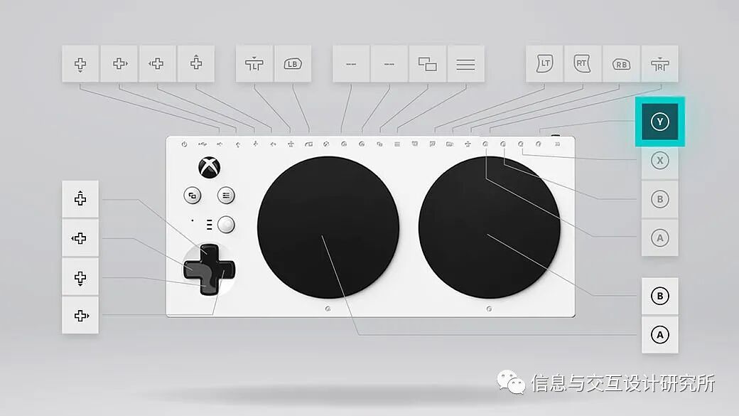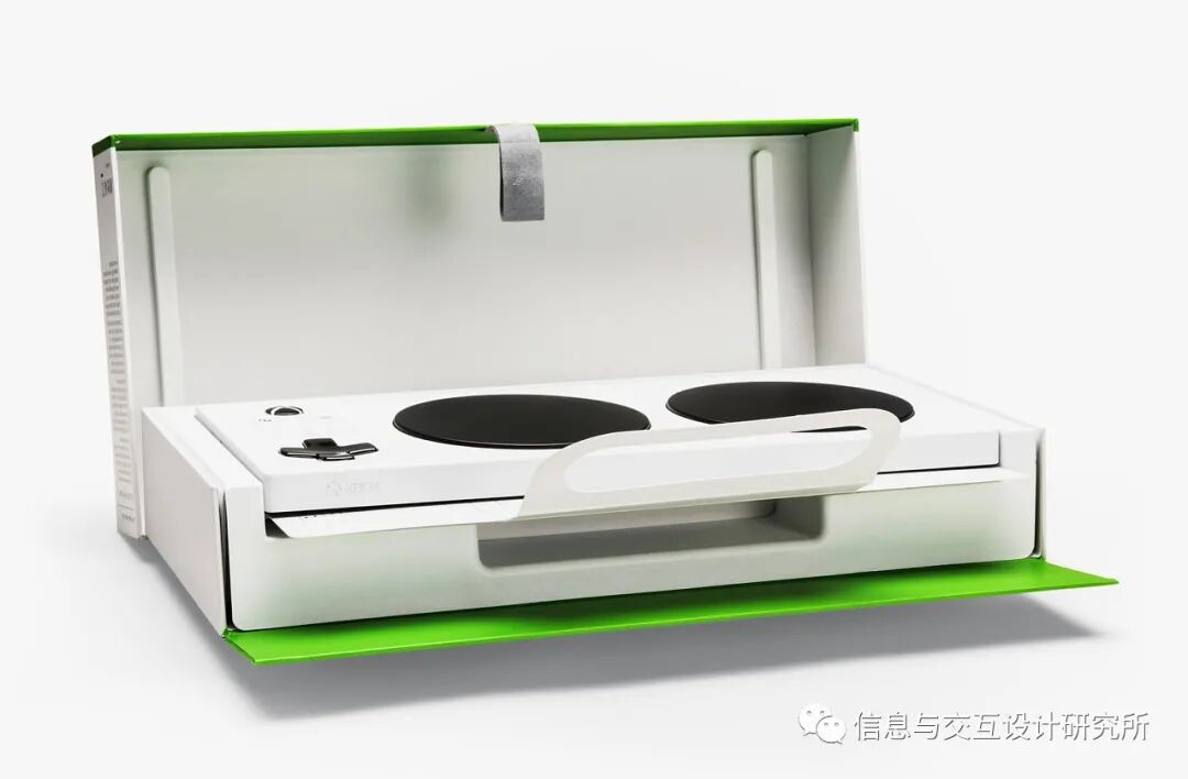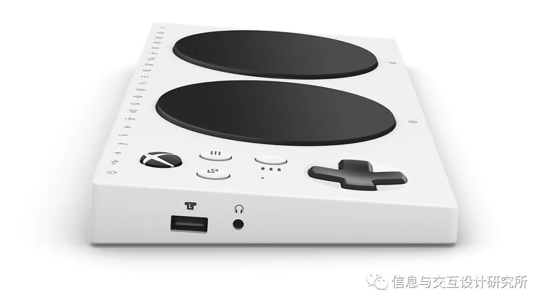 微软 Xbox控制器,这是设计中最具包容性的游戏控制台控制器。Xbox 自适应控制器在顶部表面有两个大型可编程按钮,外加一个 D-pad 和 Xbox,View,Menu 和 Profile 按钮。左侧有一个用于左拇指杆输入的 USB 端口和一个 3.5 毫米立体声耳机插孔。右拇指 USB 输入端口是唯一的右侧连接器。通过让不同残疾的玩家参与来扩大挑战和解决方案的范围。这样,那些无法脱离轮椅的高位截瘫患者可以用熟悉的轮椅操作杆作为游戏手柄,享受游戏的乐趣。不要将 Xbox 自适应控制器视为独立的可访问性游戏控制器。