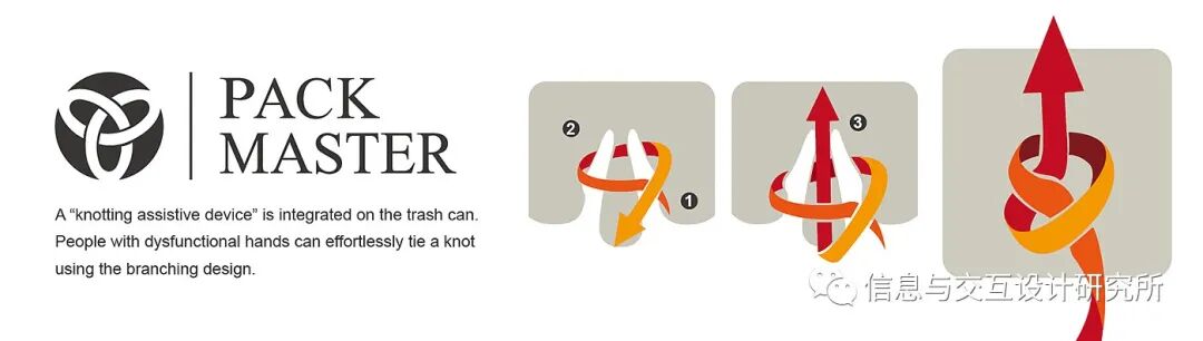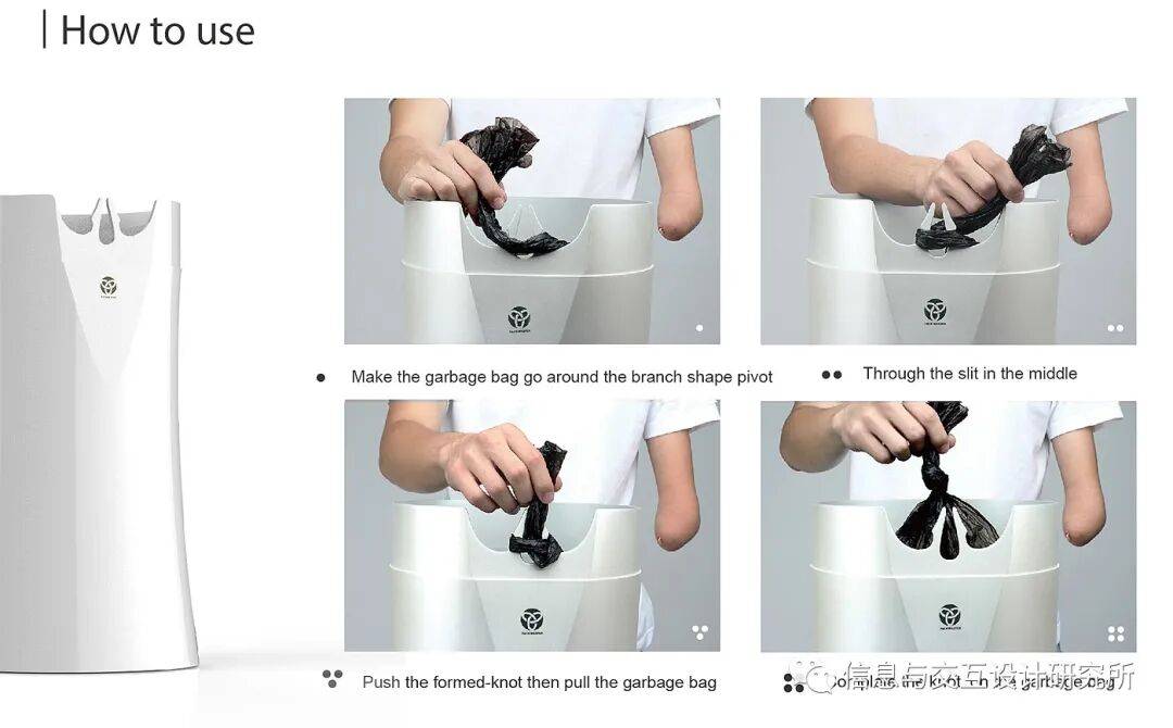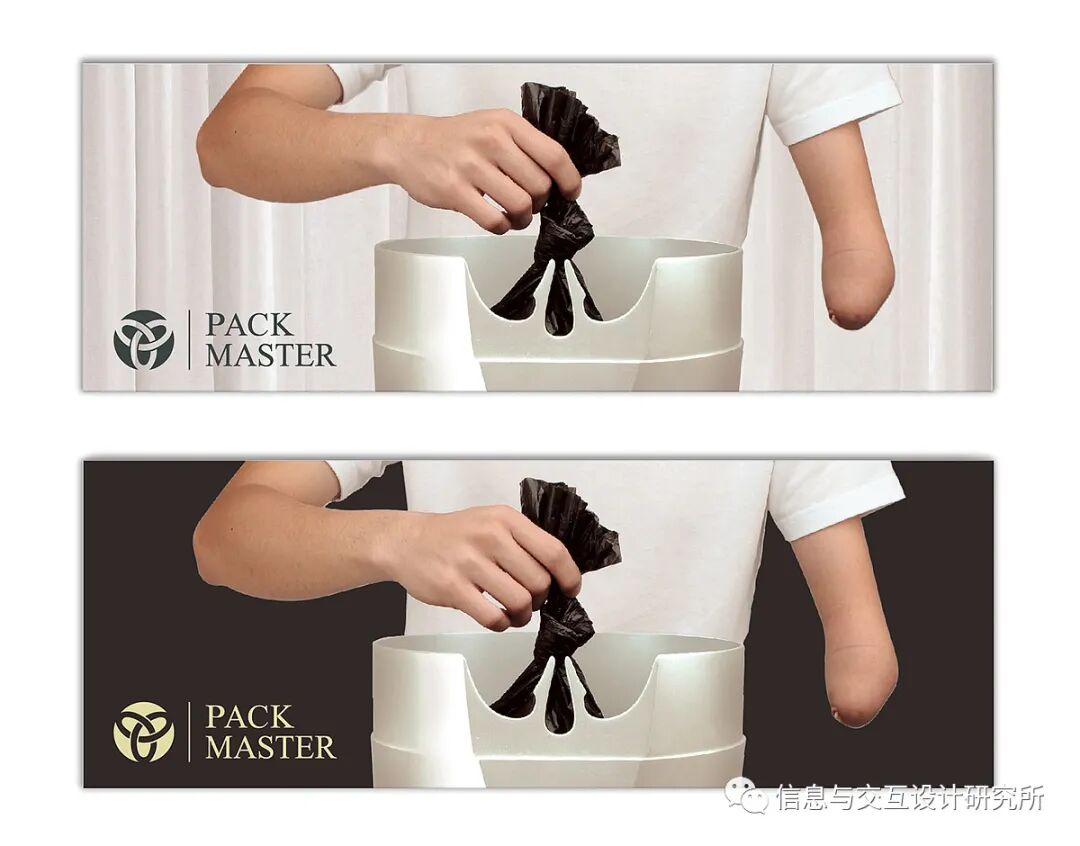 Pack Master是一款为独臂人士设计的垃圾桶,不需要借助他人帮忙,就可利用产品独特的结构,进行垃圾袋的打包。照顾到独臂人士的生活需求,带给他们较好的产品交互体验。