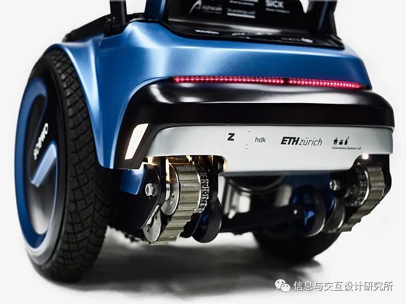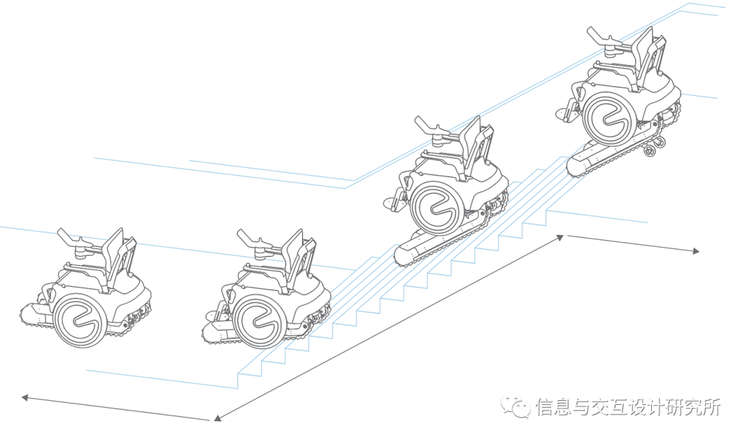 这项创新设计是行动不便人士的福音,轮椅底部安装了多条橡胶履带,可以穿过障碍物,还能在楼梯上平稳安全地前行。