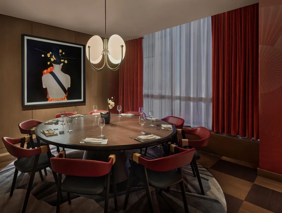 同时,红漆公用桌由一盏定制的枝形吊灯照亮,其形状懒洋洋地起伏,看起来像墨水中的波浪,别具一番风味。