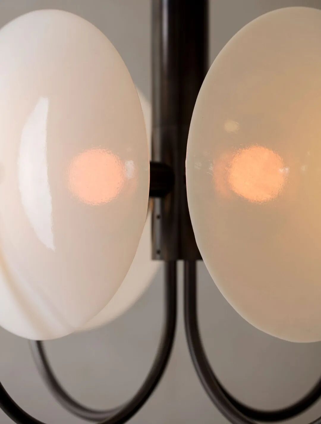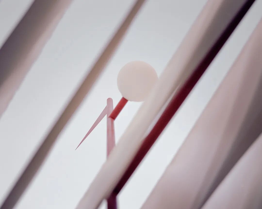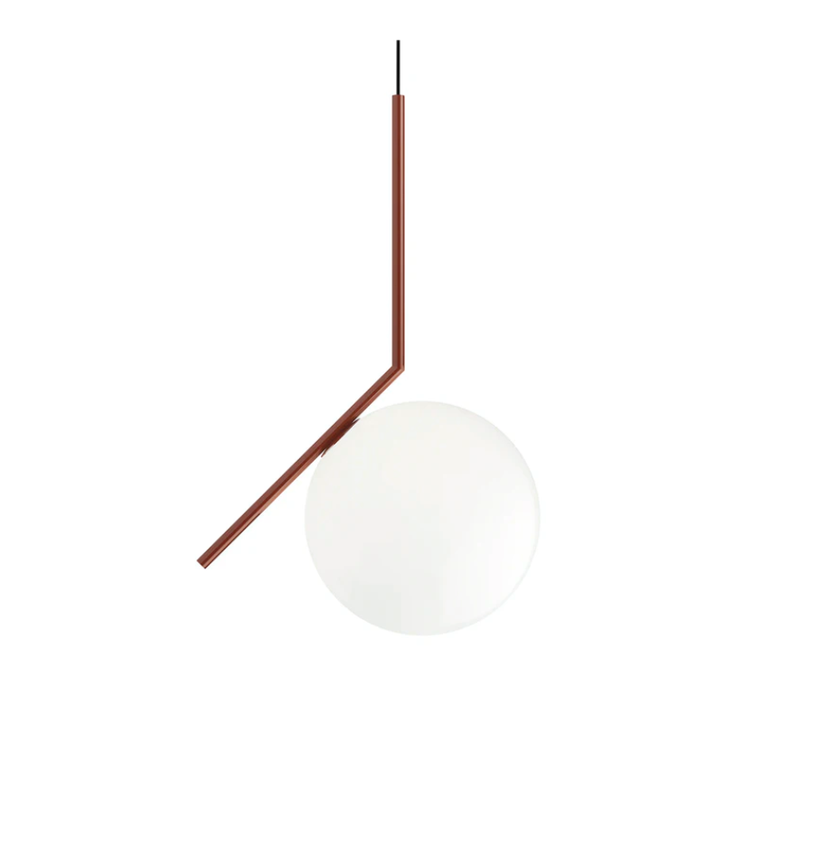 一个玻璃球在倾斜的指挥棒末端以微妙的平衡向外突出。这个乳白色的球显然是不稳定的,看起来好像它可能会溜走,就好像它是杂耍者表演的装置,球体和指挥棒在其中神奇地平衡了。无论是颜色、还是形状都和餐厅风格搭配的恰到好处。