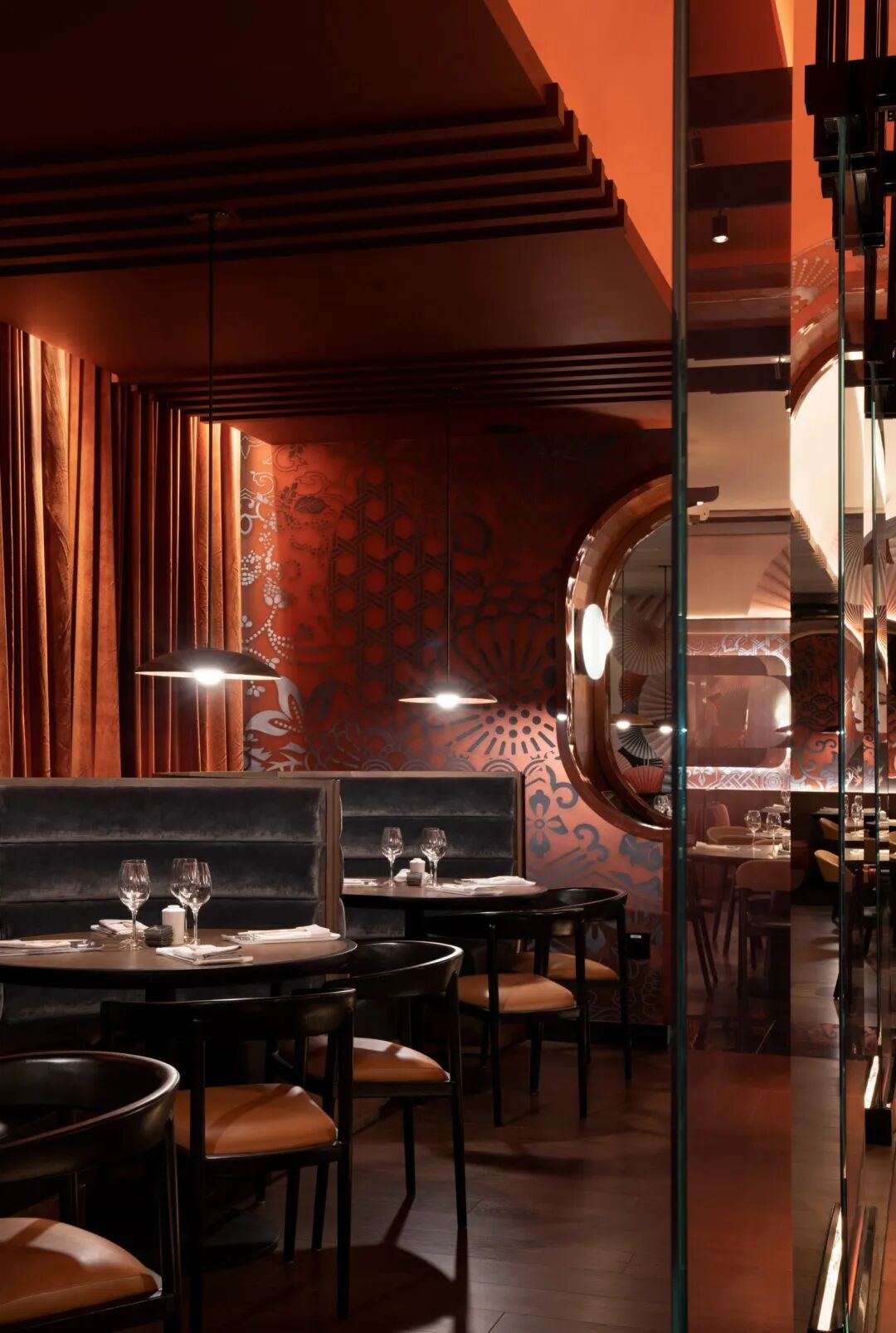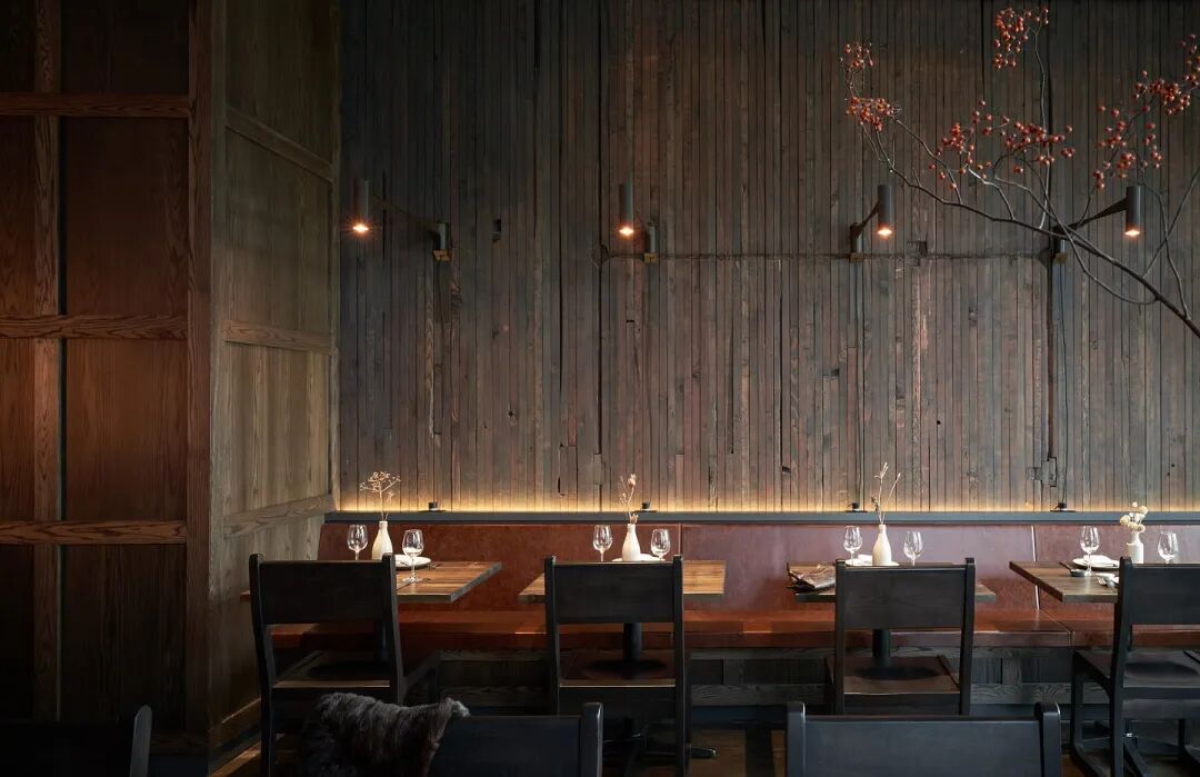 在整个室内,定制设计和制造的照明装置是重要的接触点,将火的精神带入照明方案。餐厅的深色调增强了壁炉火光和定制照明的体验。同时保持低光也有助于营造与空间和食物的亲密感。