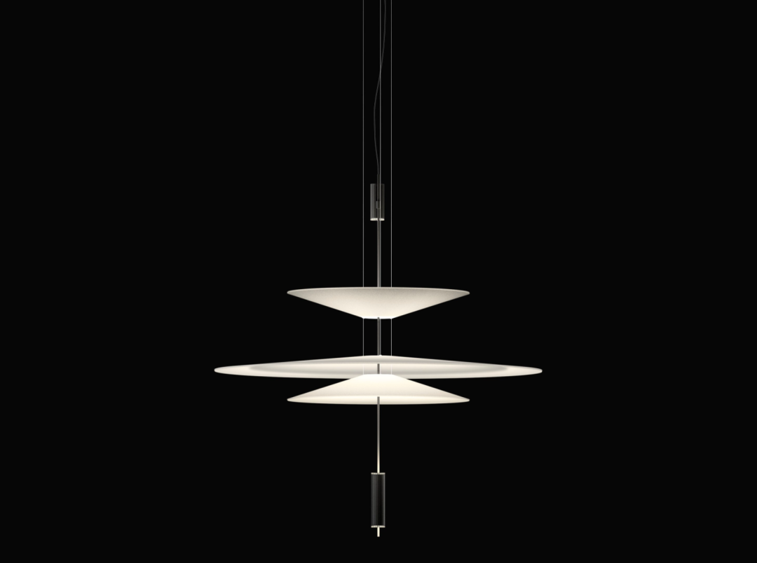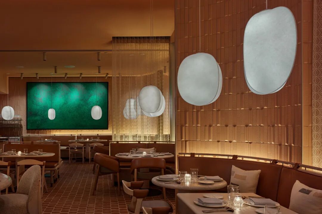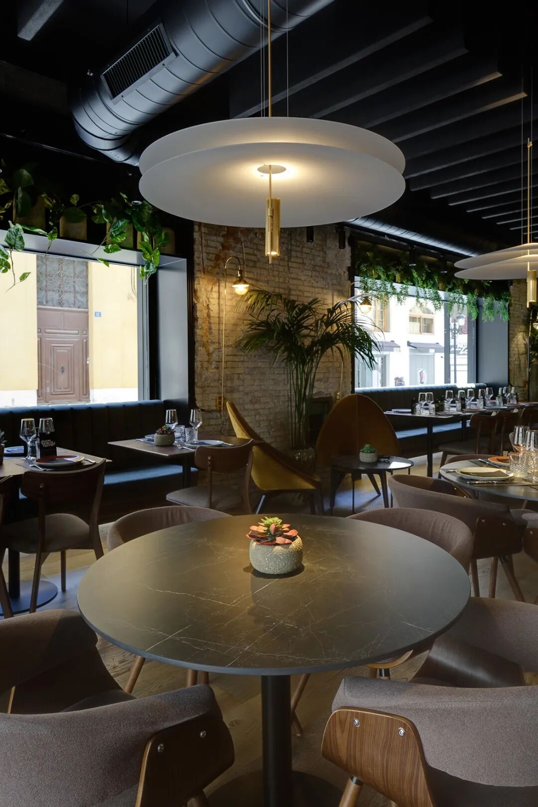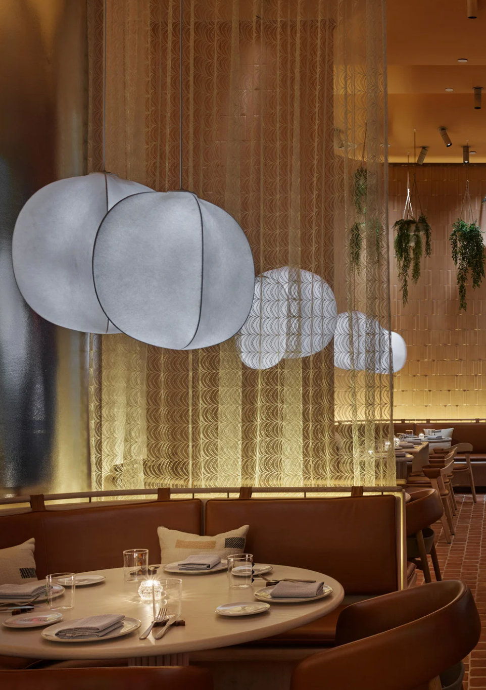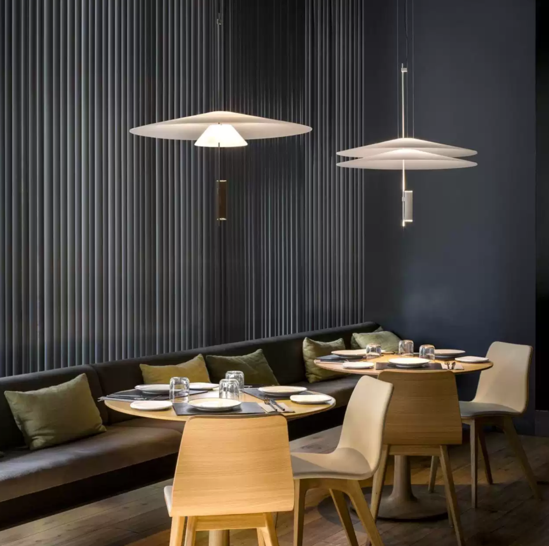 Vibia的Flamingo吊灯散发出一种近乎神秘的现代感,与餐厅的设计感和形状相呼应。浮动圆盘的谜团以精美的金色硬件为基础,散发的灯光仿佛将人们聚集在一起,可以尽情交谈、享受美食。