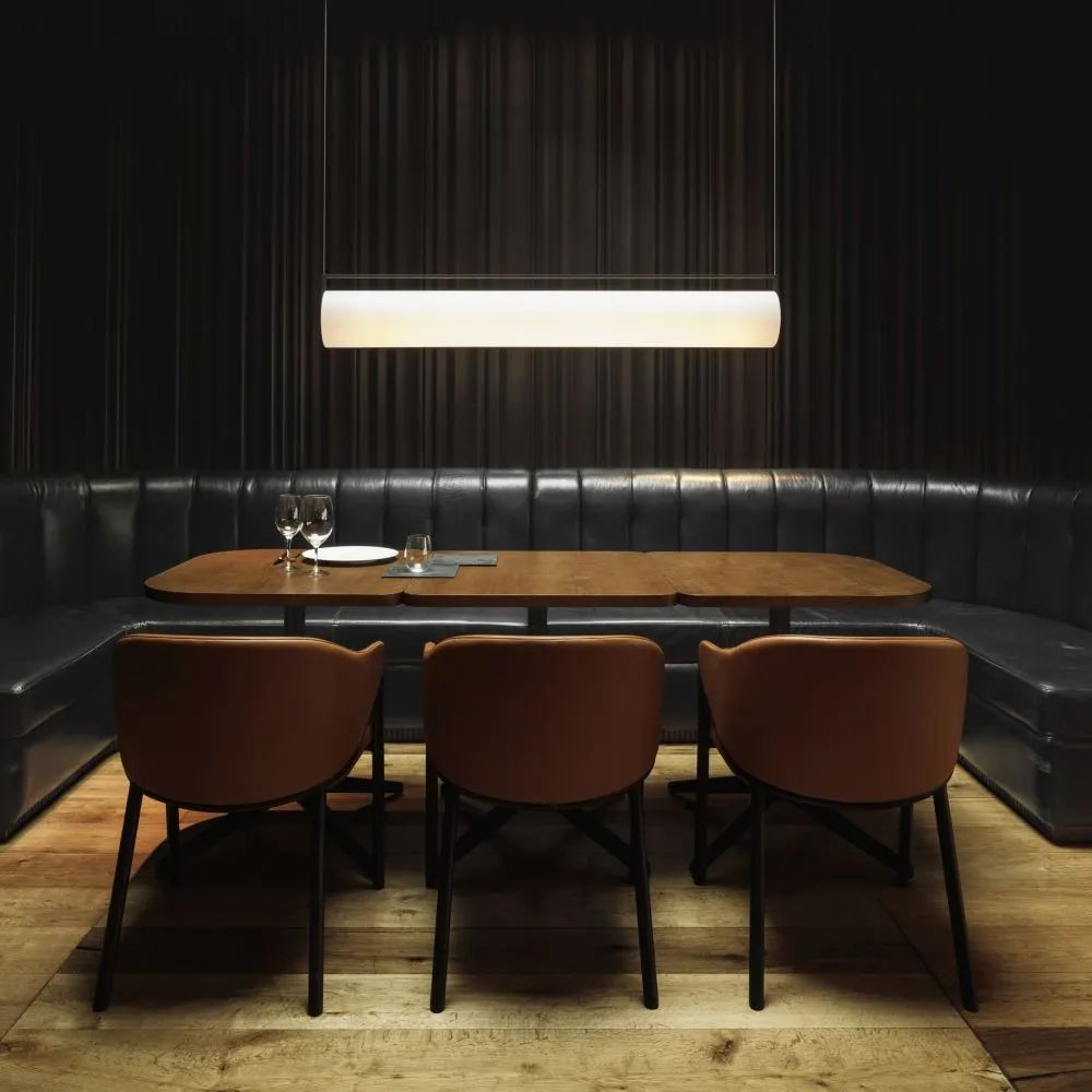 Banquette 照明由一个定制设计的名为 Mallet 的旋转臂夹具提供(还具有滚花和古铜色饰面),使照明能够摆动并适应桌子分组。