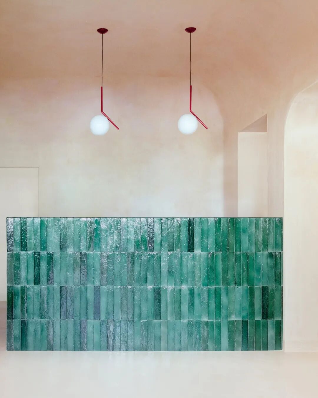 这是一家位于撒丁岛的比萨店。“温馨而私密”的空间几乎没有配备定制物品,例如以不同色调呈现的瓷砖柜台,以呼应当地磨砂膏的颜色。这些冷色调与Michael Anastassiades 为 Flos设计的酒红色灯光形成鲜明对比,整个餐厅都在使用这些灯光。