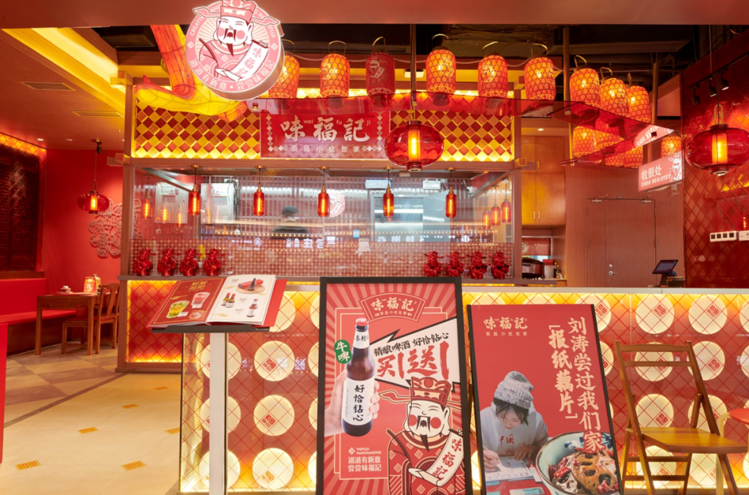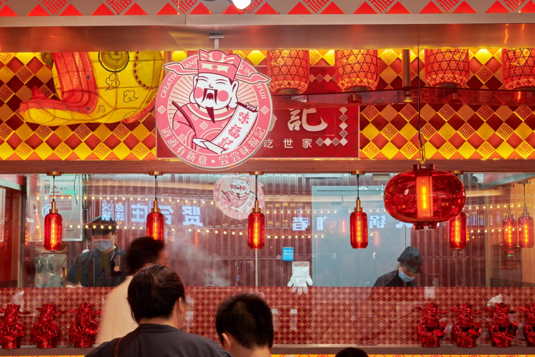空间上,「荣品牌」朝着“大众,日常,高频”的方向打造符合小吃品类的大众福文化主题空间。