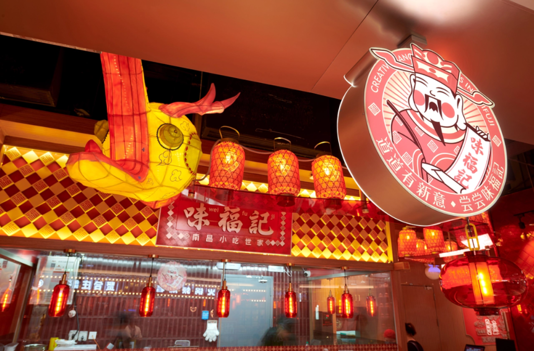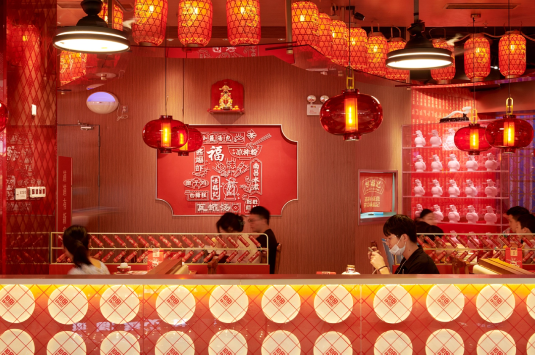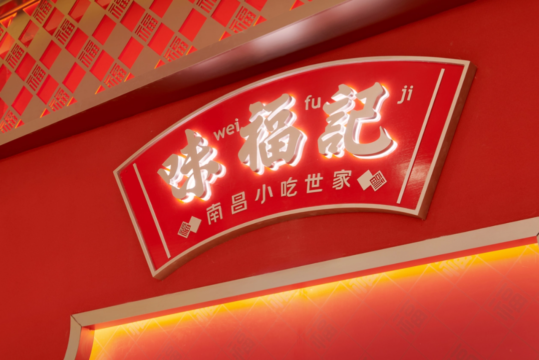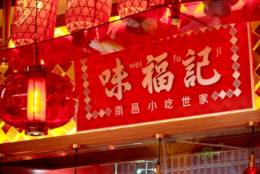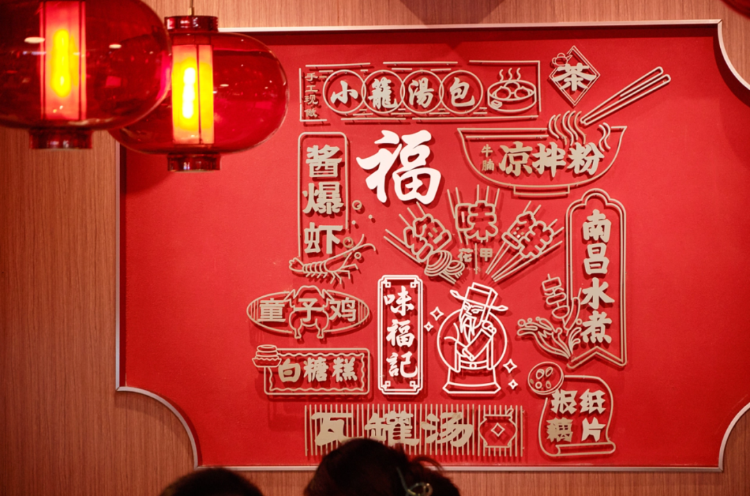 1、紧紧围绕味福记品牌资产,建立品牌空间壁垒。门头,墙面,桌椅,隔断,地面...空间每一处都在被福文化包裹,整体打造成一个有南昌特色的福文化主题空间。