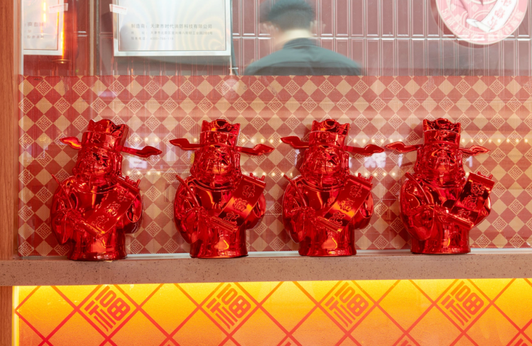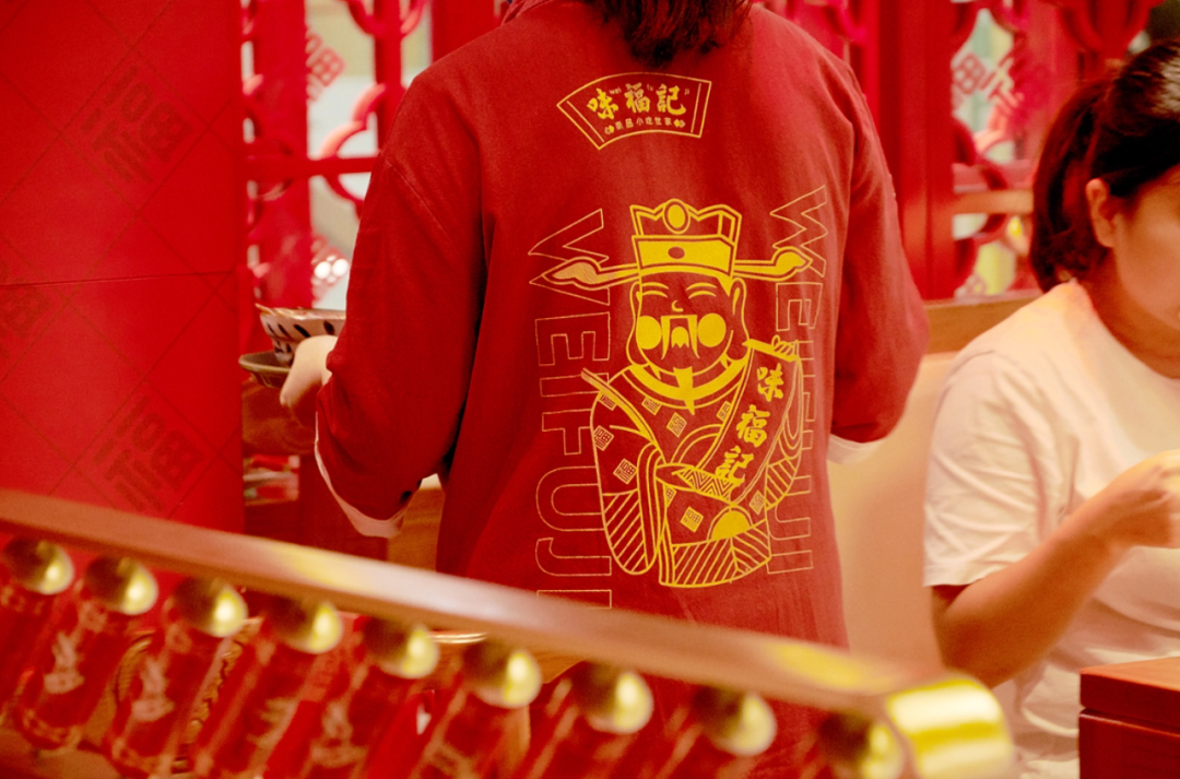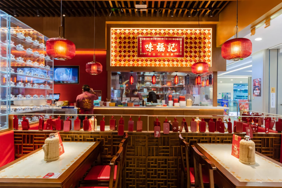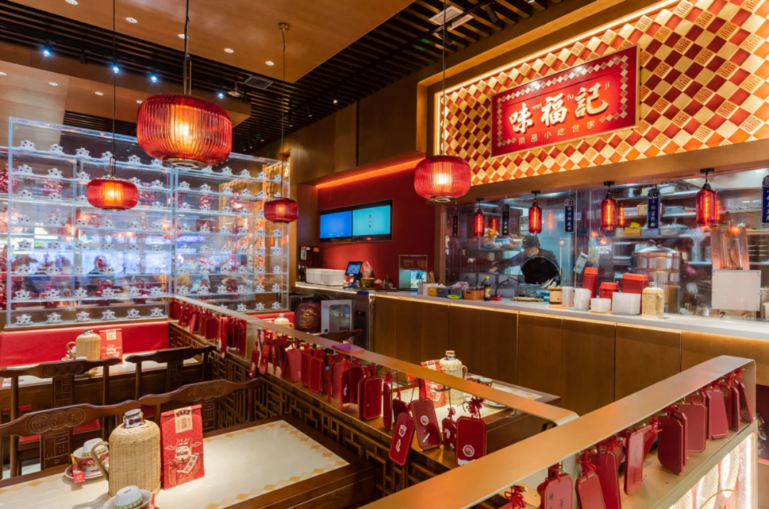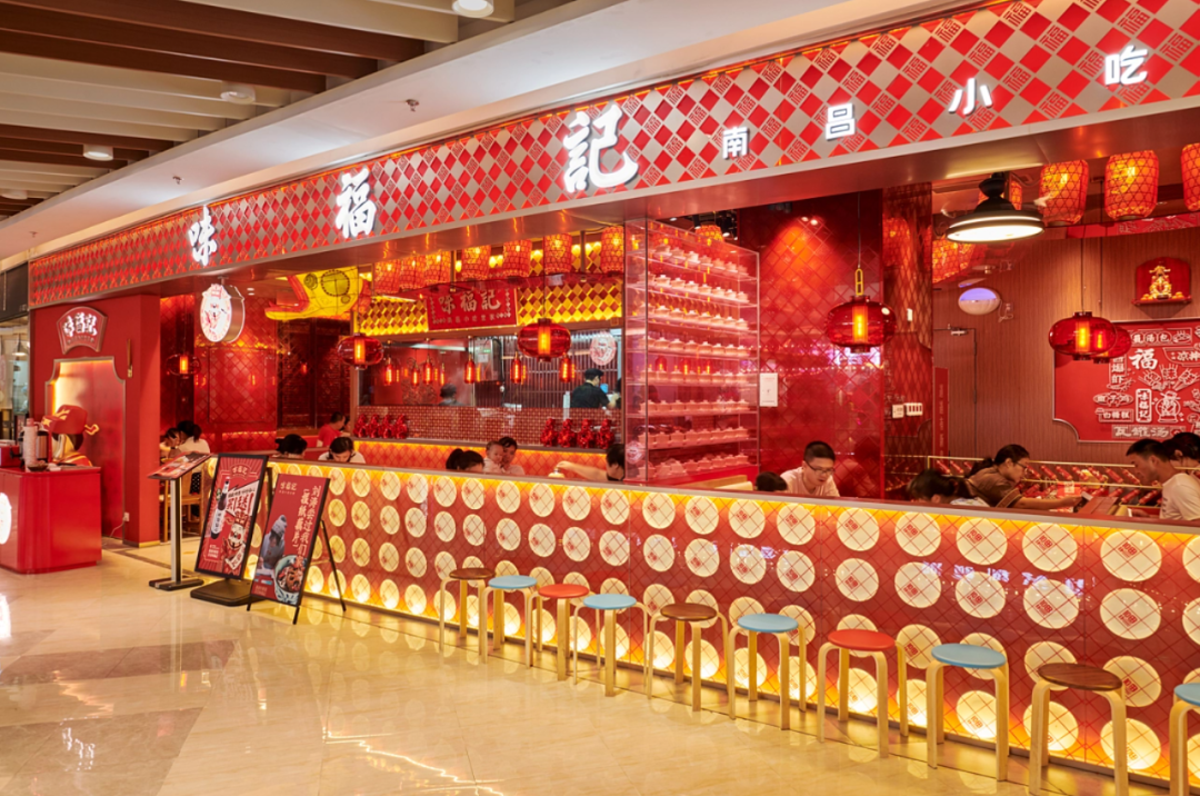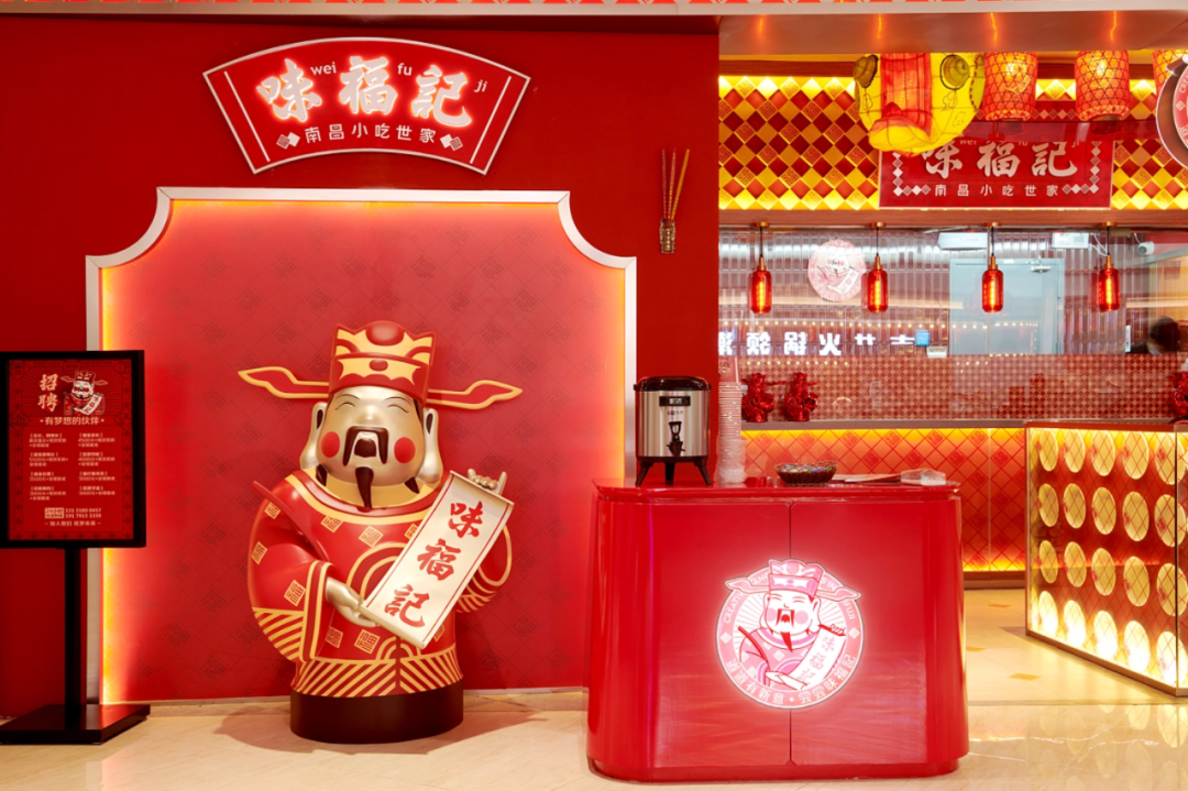 1、紧紧围绕味福记品牌资产,建立品牌空间壁垒。门头,墙面,桌椅,隔断,地面...空间每一处都在被福文化包裹,整体打造成一个有南昌特色的福文化主题空间。