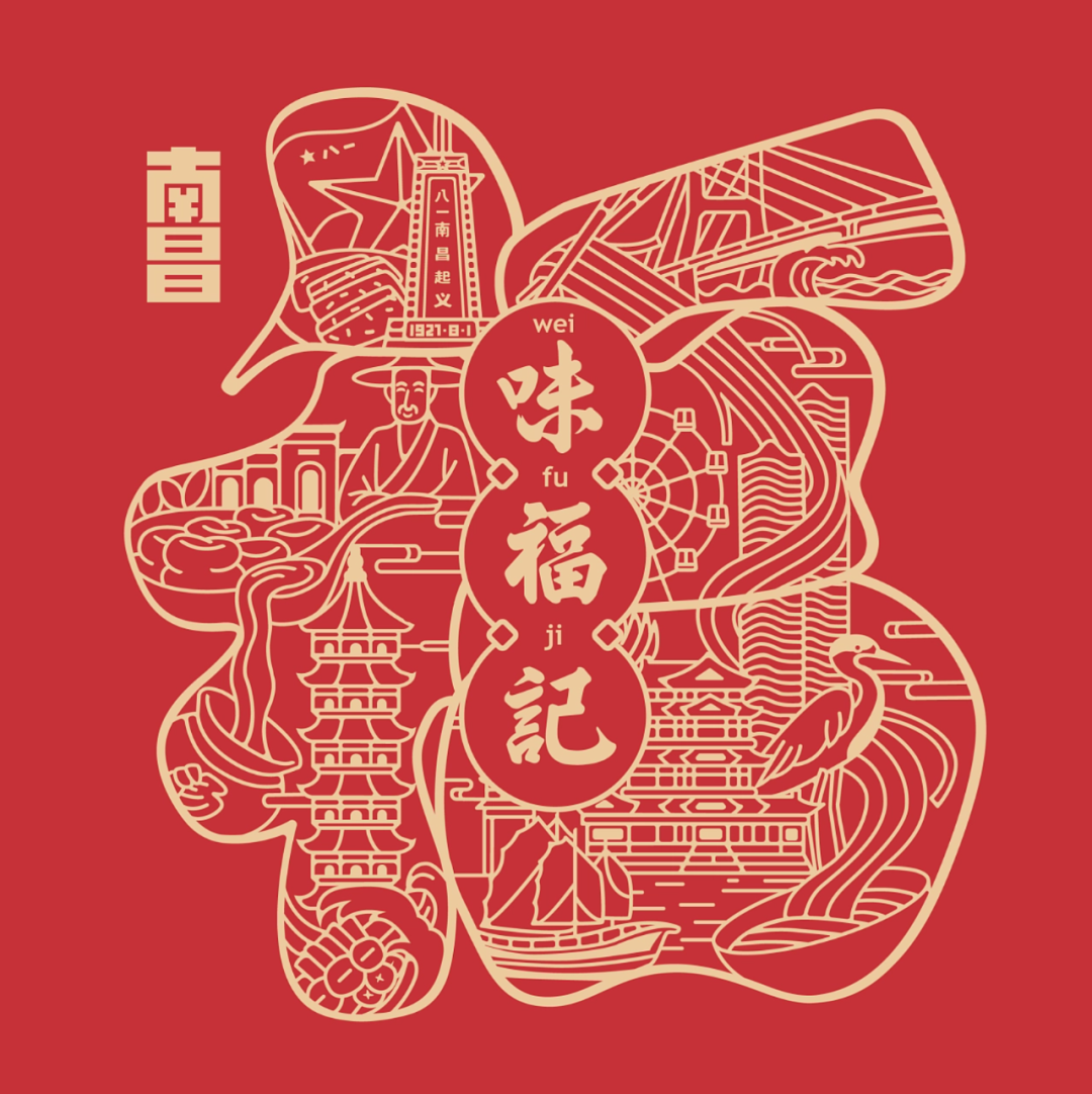 以福字为主视觉框架,结合南昌十大人文符号,创作品牌专属福字超级画面“福在南昌”。