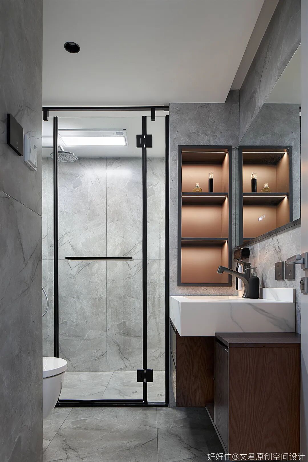 文君原创空间设计:先是卫生间。整体色调沉稳理性,通铺大理石纹路的墙地砖,辅以木色的收纳柜体,再配合凹龛的使用,存放女主人各种各样的护肤品足够了。