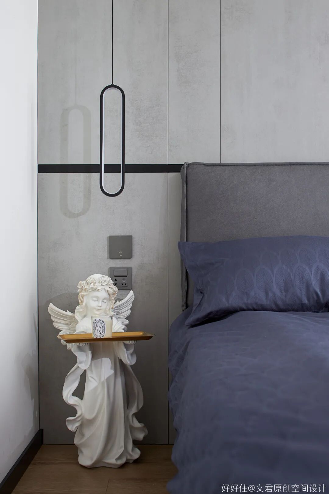文君原创空间设计:细节图。天使雕像床头托台、时尚线型吊灯,营造出莫名的和谐感。