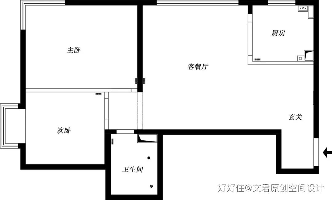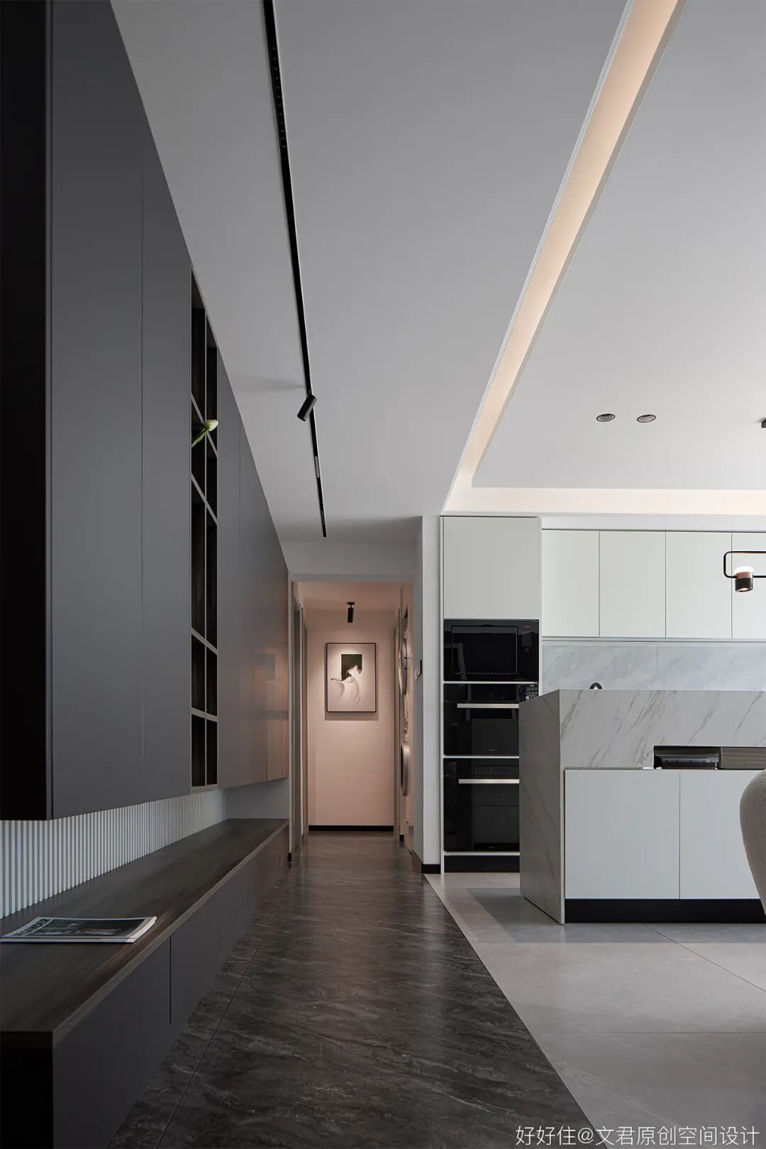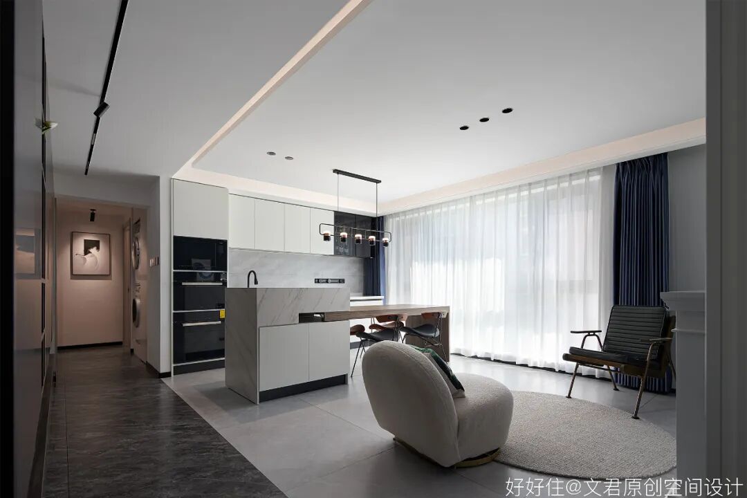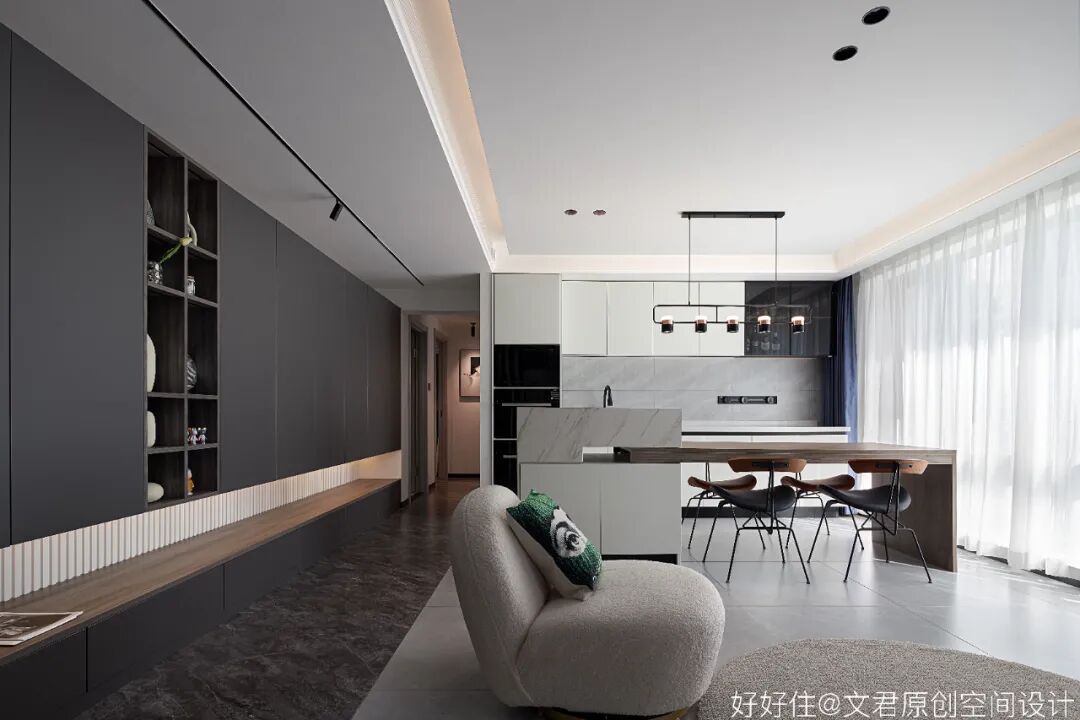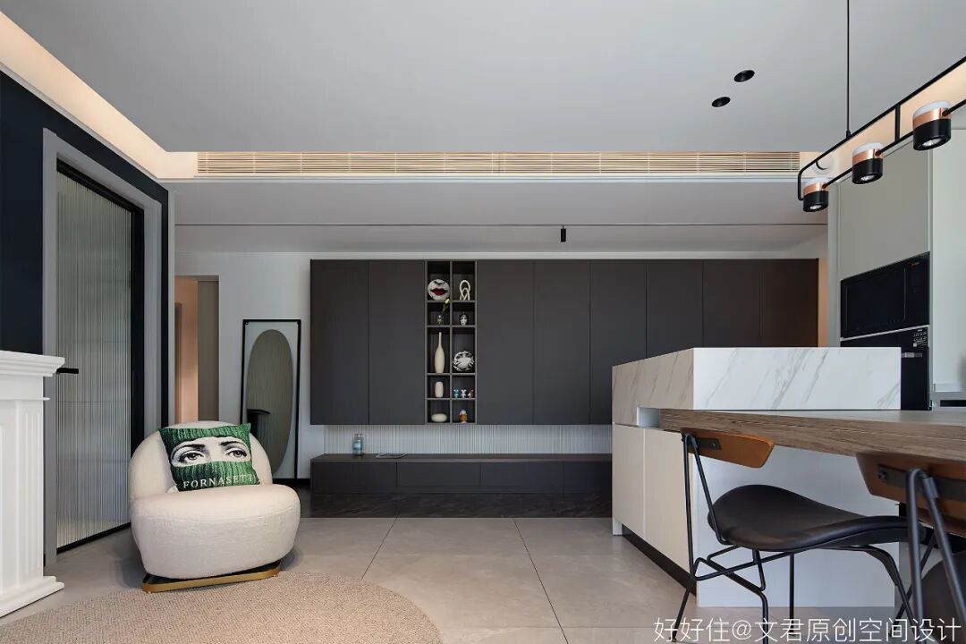 文君原创空间设计:从厨房隔墙看。区别于传统的客餐厅,经过和业主讨论方案后,最终表示将电视放在了主卧,客厅没有电视/投影,灰色和木色交错的柜体,白色的单人沙发,黑白交错的橱柜等,以低饱和度的“高冷”姿态,精准适配作为空间的主旋律。