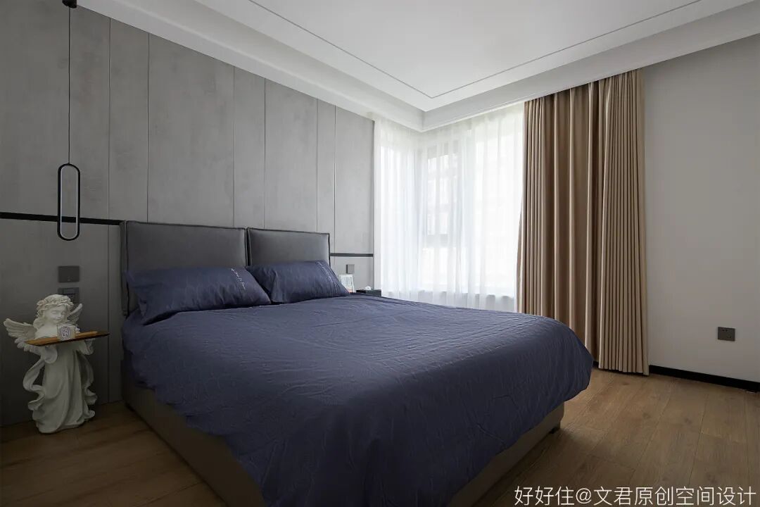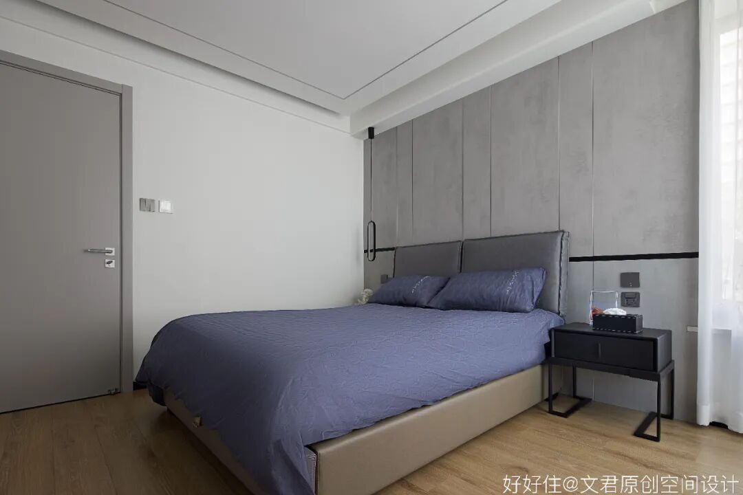 文君原创空间设计:卧室延续了简约时尚的现代风格。整体没有过多的造型,配色简单。L形窗户连接上了灰色护墙板,床与墙体间宽裕的位置是预留出的婴儿床区域,方便未来业主照顾孩子。