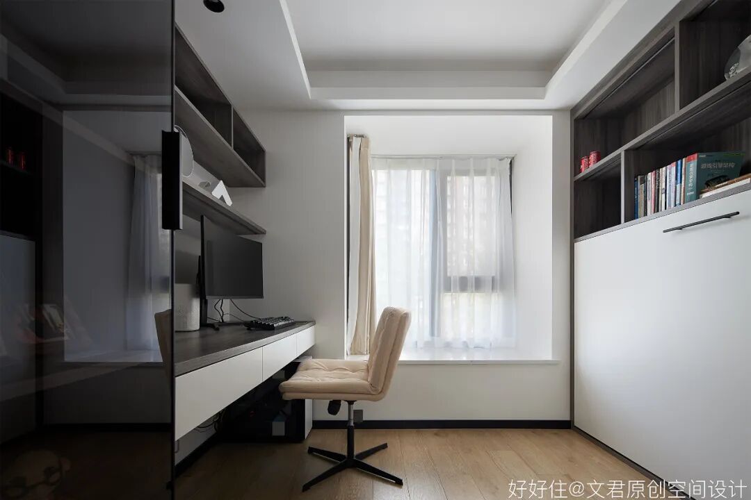 文君原创空间设计:从窗户方向看,以多功能的形式展开,不需要过多的个性化设计。未来在宝宝出生之前,这里是男主人的书房;在有客人留宿的情况下,这里可以变成次卧;在宝宝可以独立睡觉的时候,这里可以变成儿童房。